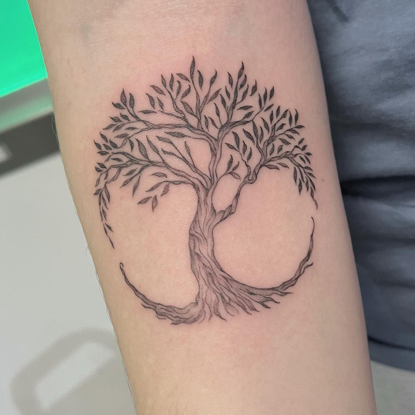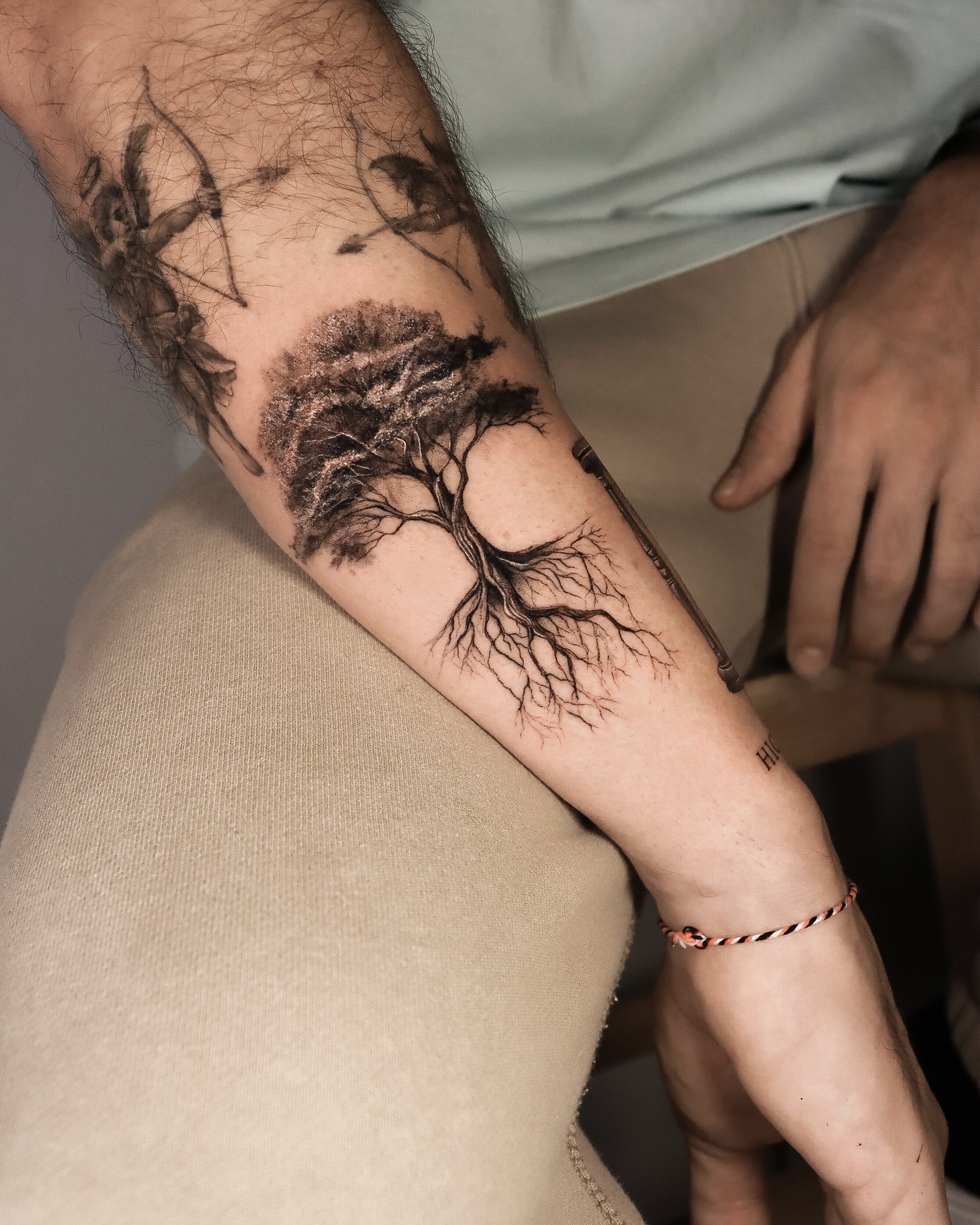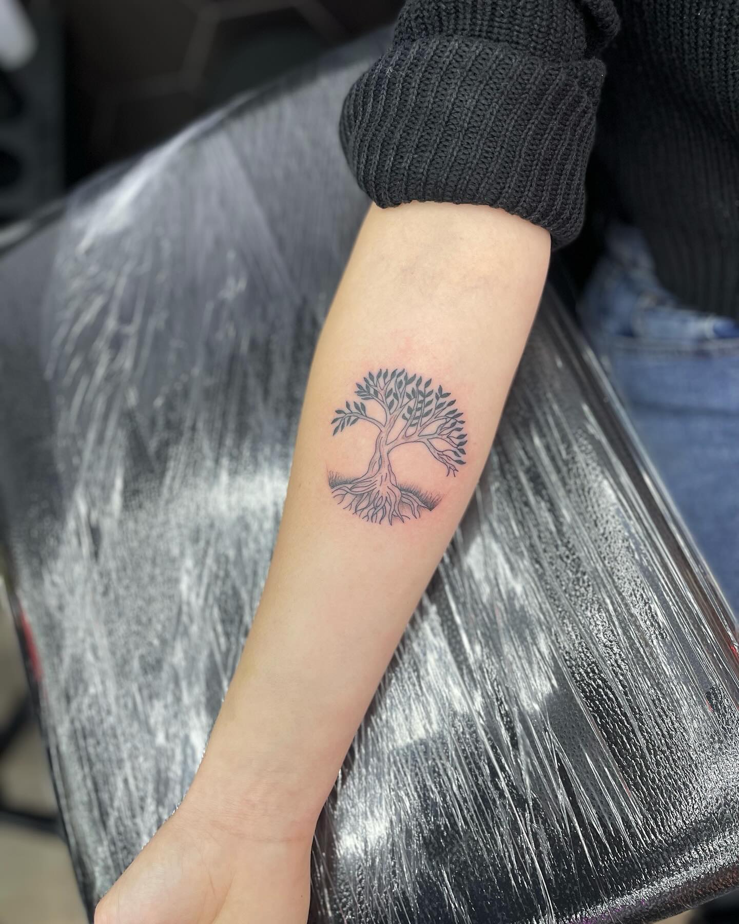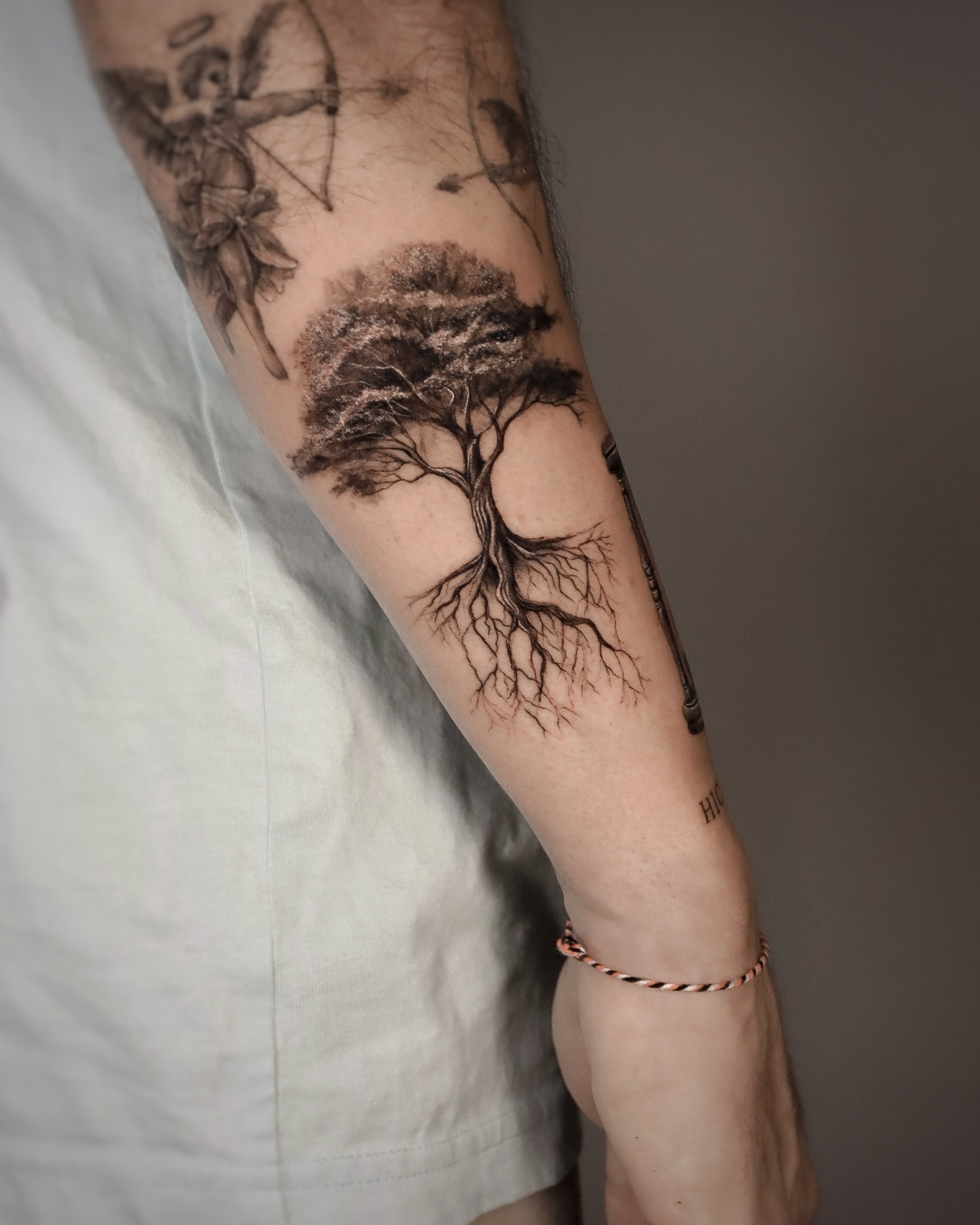The tattoo features a tree with a textured canopy and intricate roots that extend down the forearm.