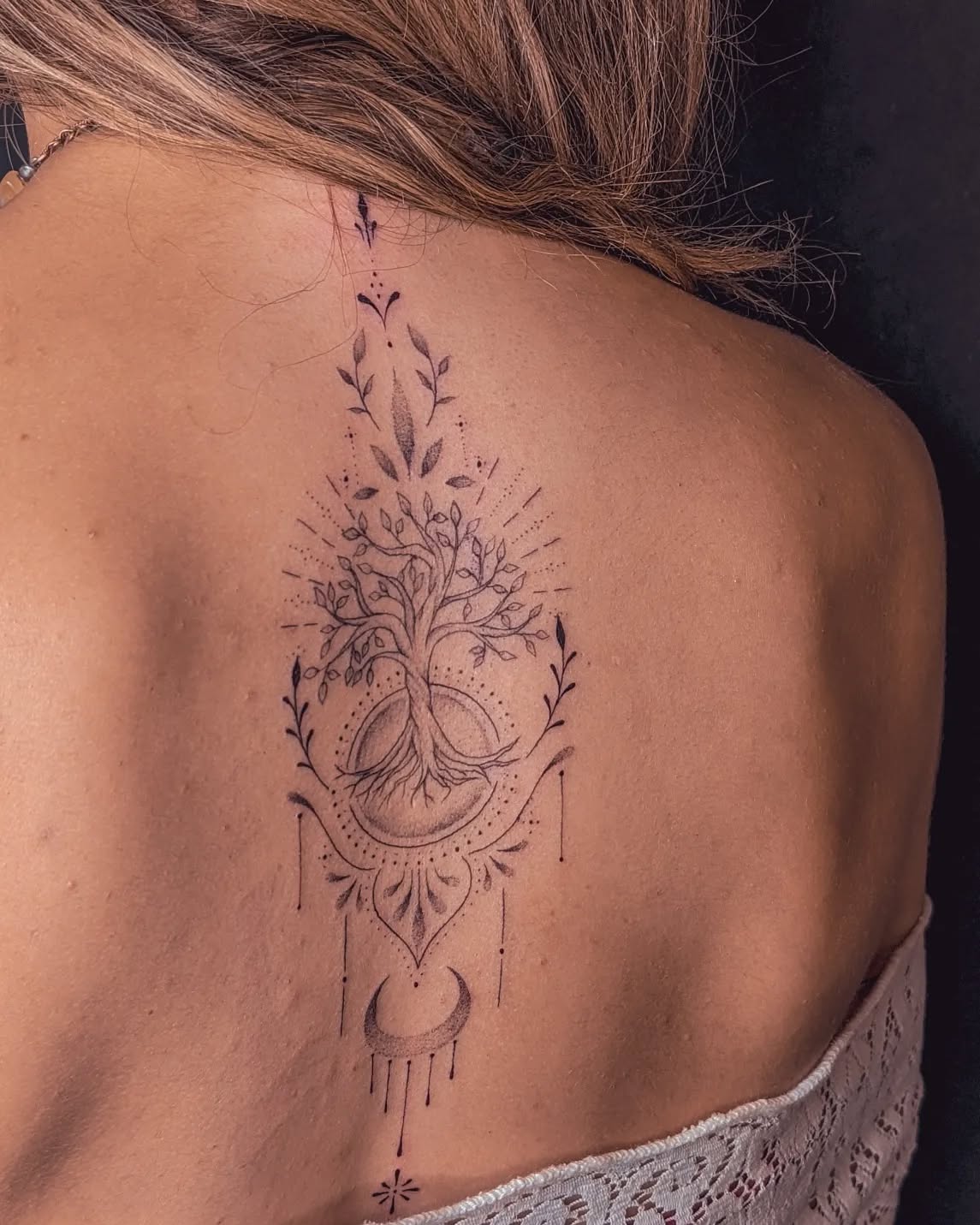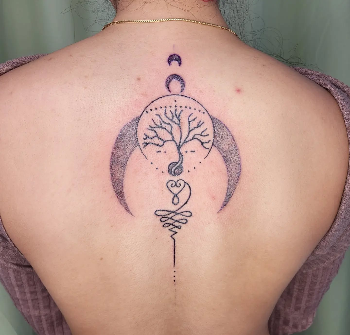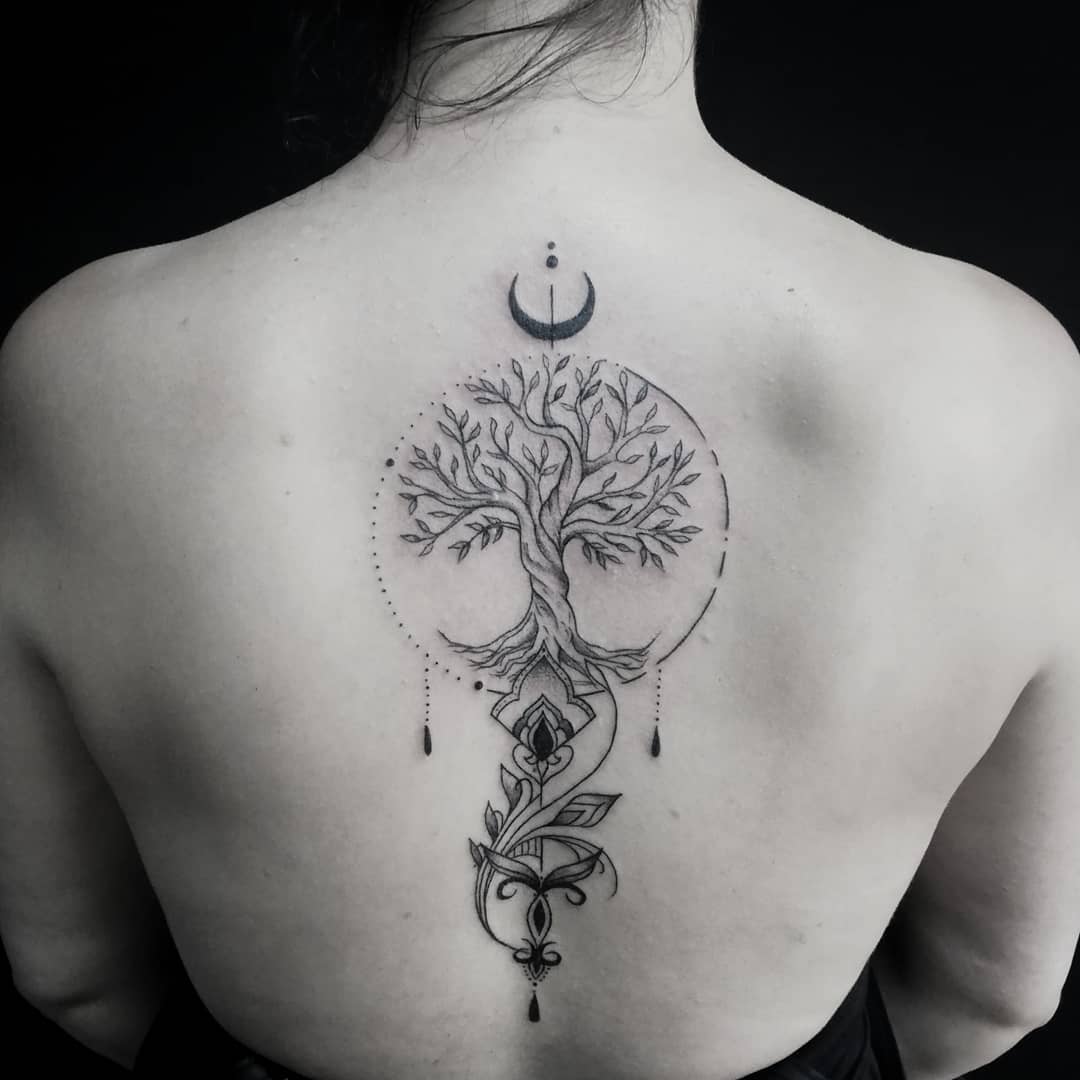 The tattoo features a central tree of life surrounded by crescent moons and delicate line work.