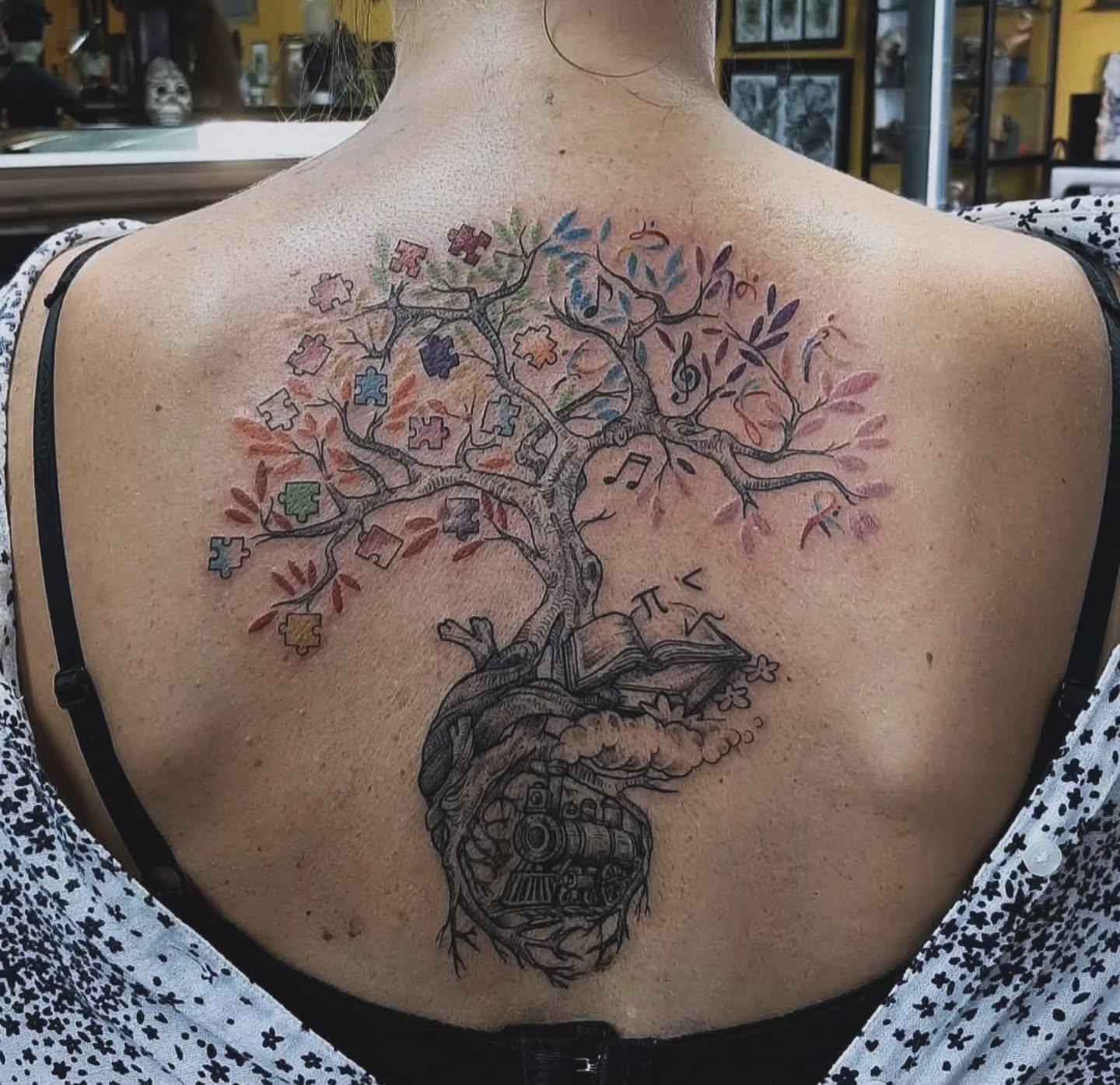 The tattoo features a tree with vibrant puzzle-shaped leaves and musical notes woven throughout its branches.