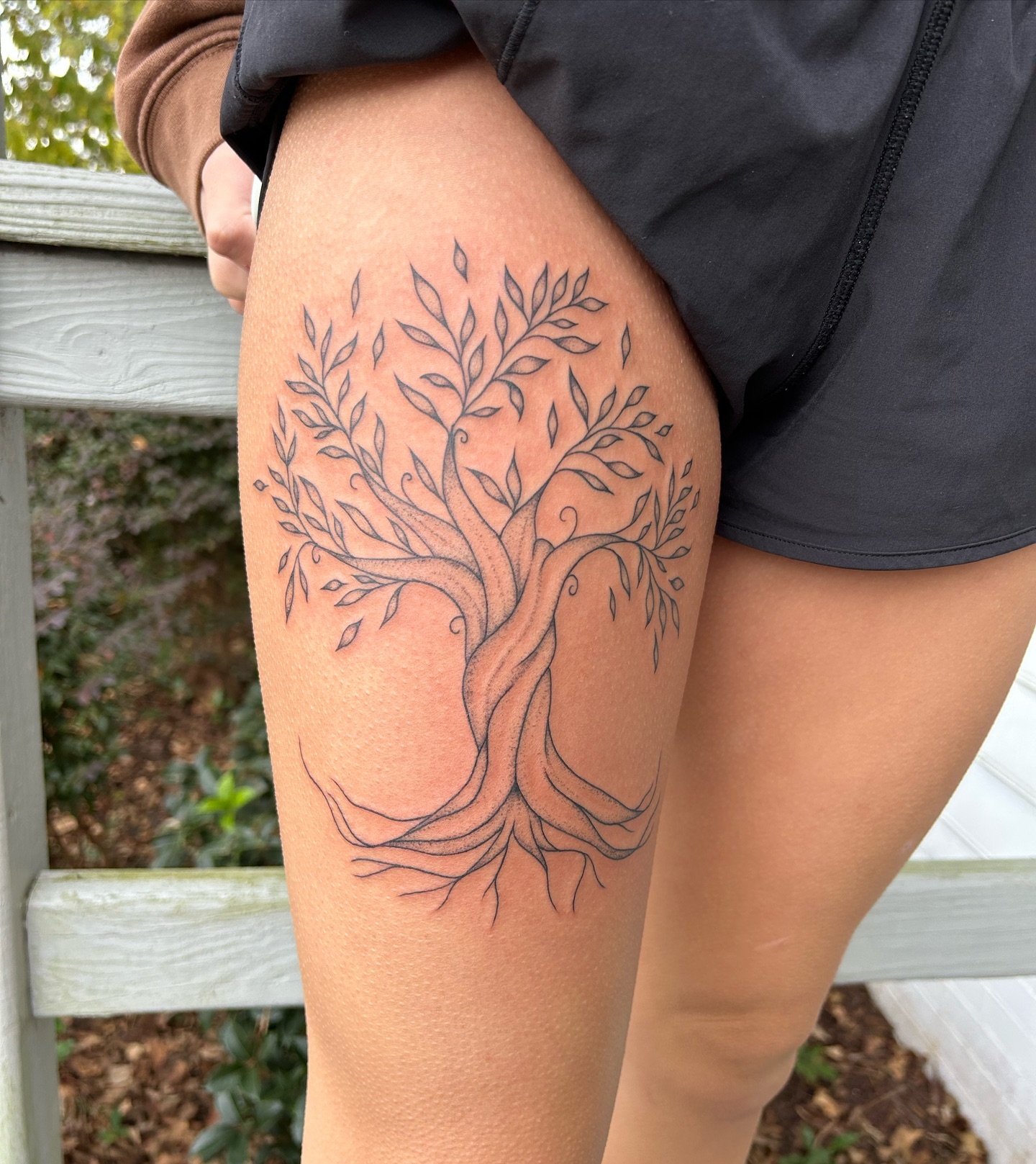 This design combines fine line work and shading to create depth, making the tree appear lifelike and dynamic.