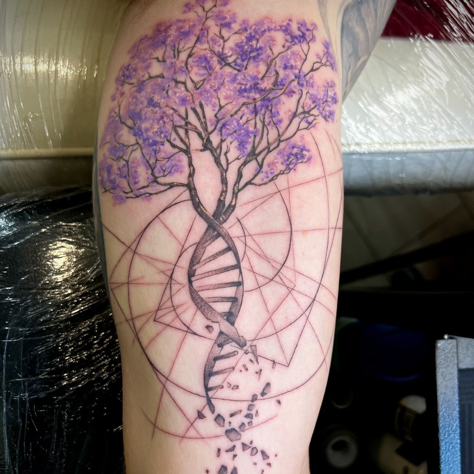 The tattoo features a striking tree with purple blossoms intertwined with a DNA spiral in the center.