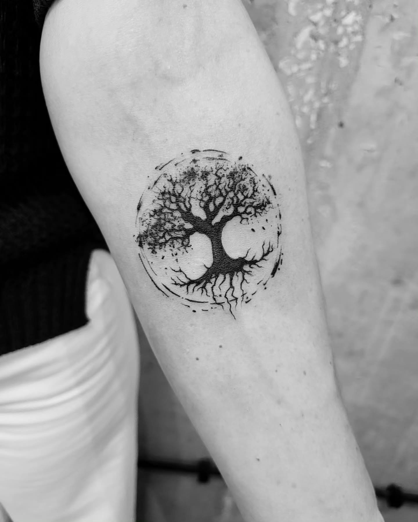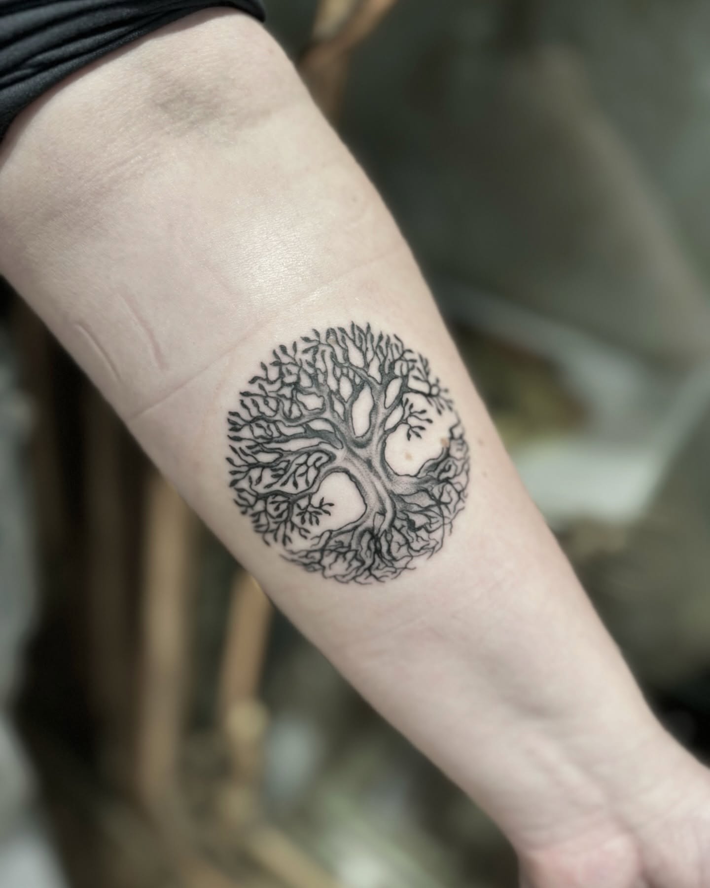The tattoo features a tree enclosed in a circular shape, showcasing intricate branches and roots.