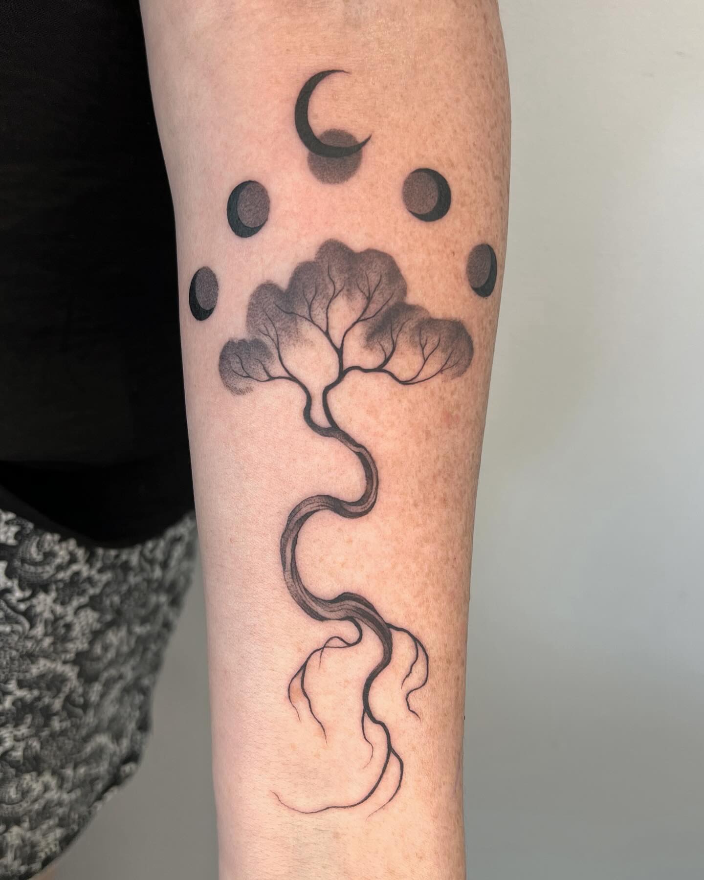 The smooth lines and shading of the tree contrast with the bold, dark shapes of the moons, showcasing a skilled approach to tattoo artistry.