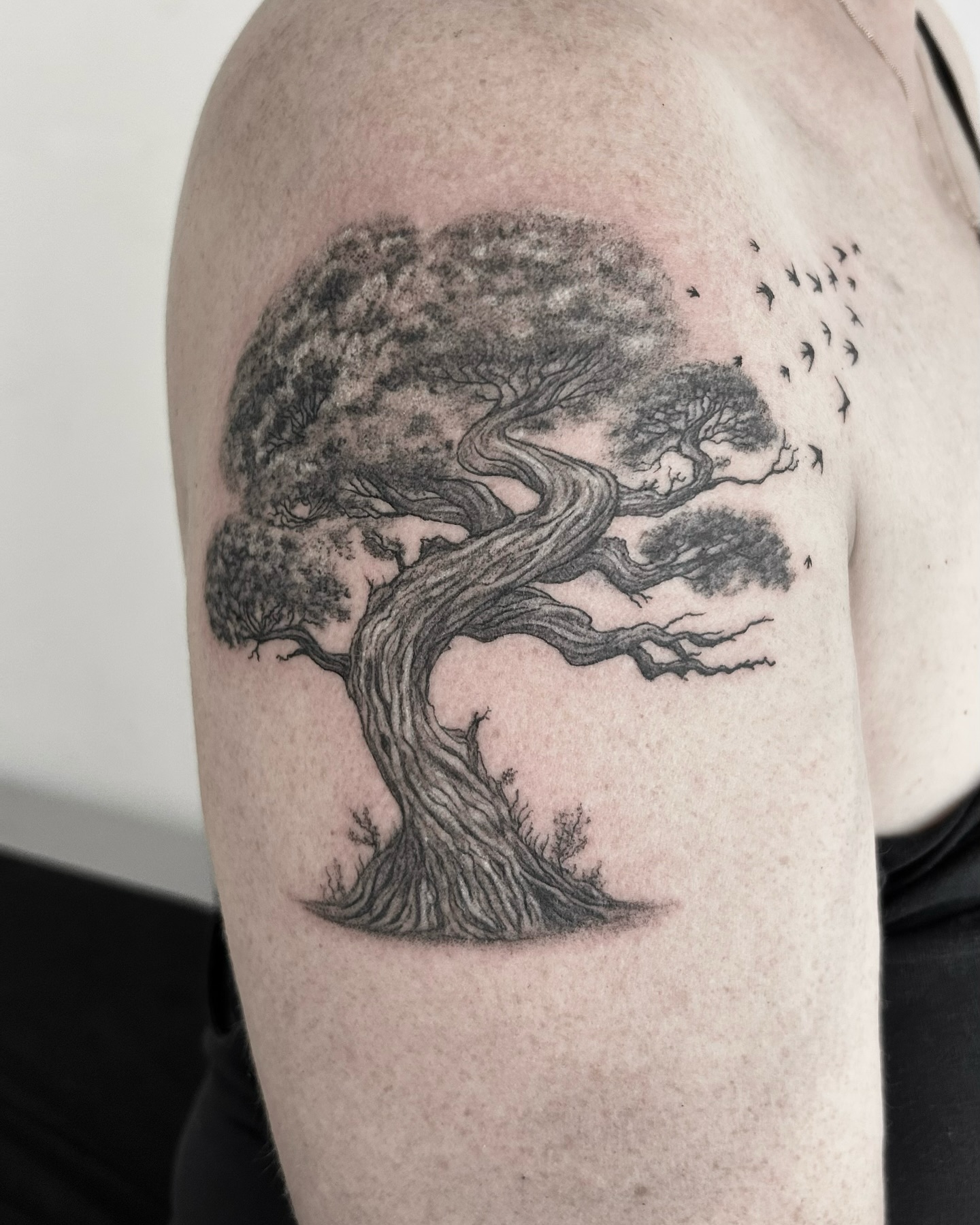 The tattoo features a prominently twisted trunk, showcasing intricate bark details and a lush canopy.