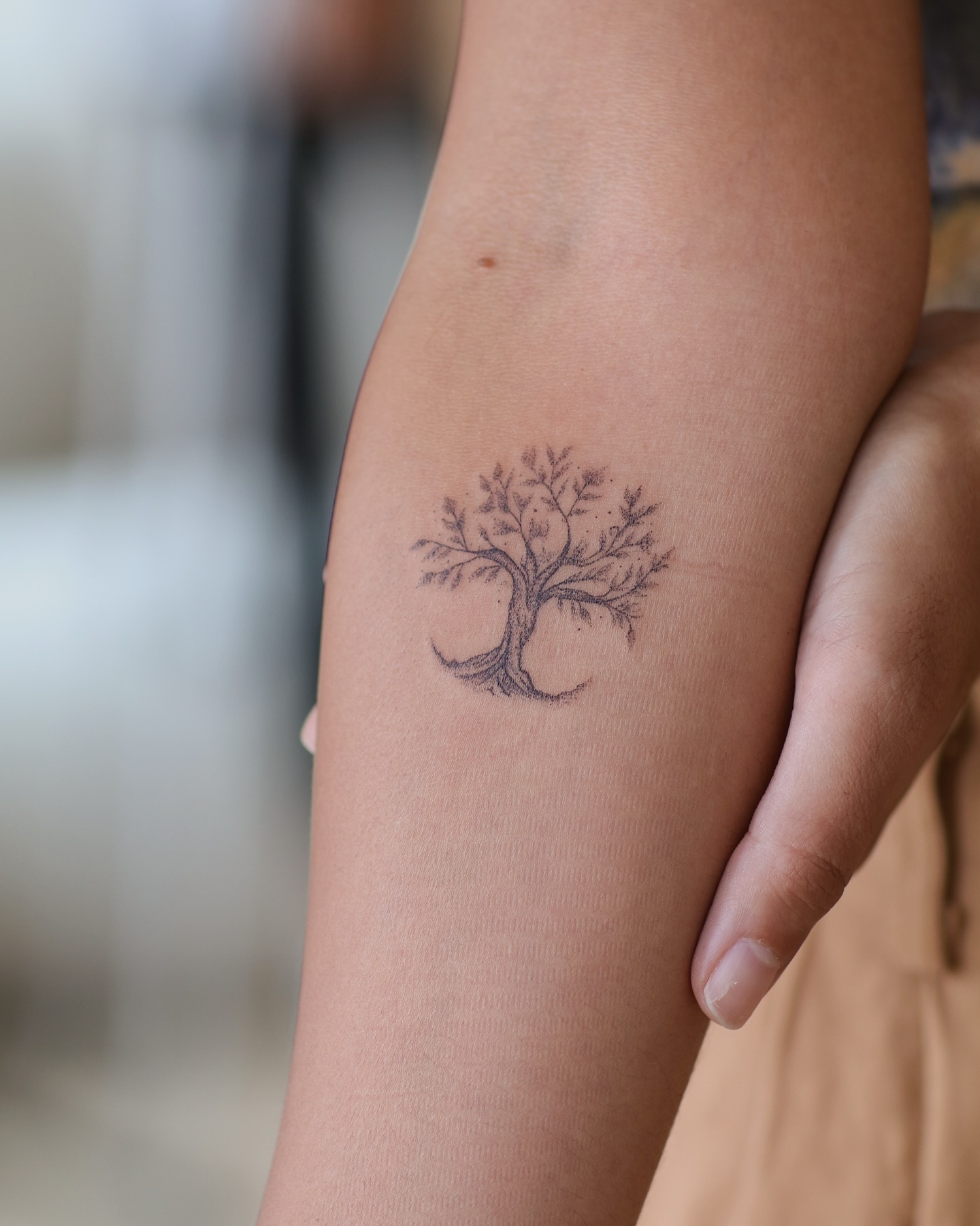 The tattoo features a small, intricately designed tree with delicate branches and leaves.