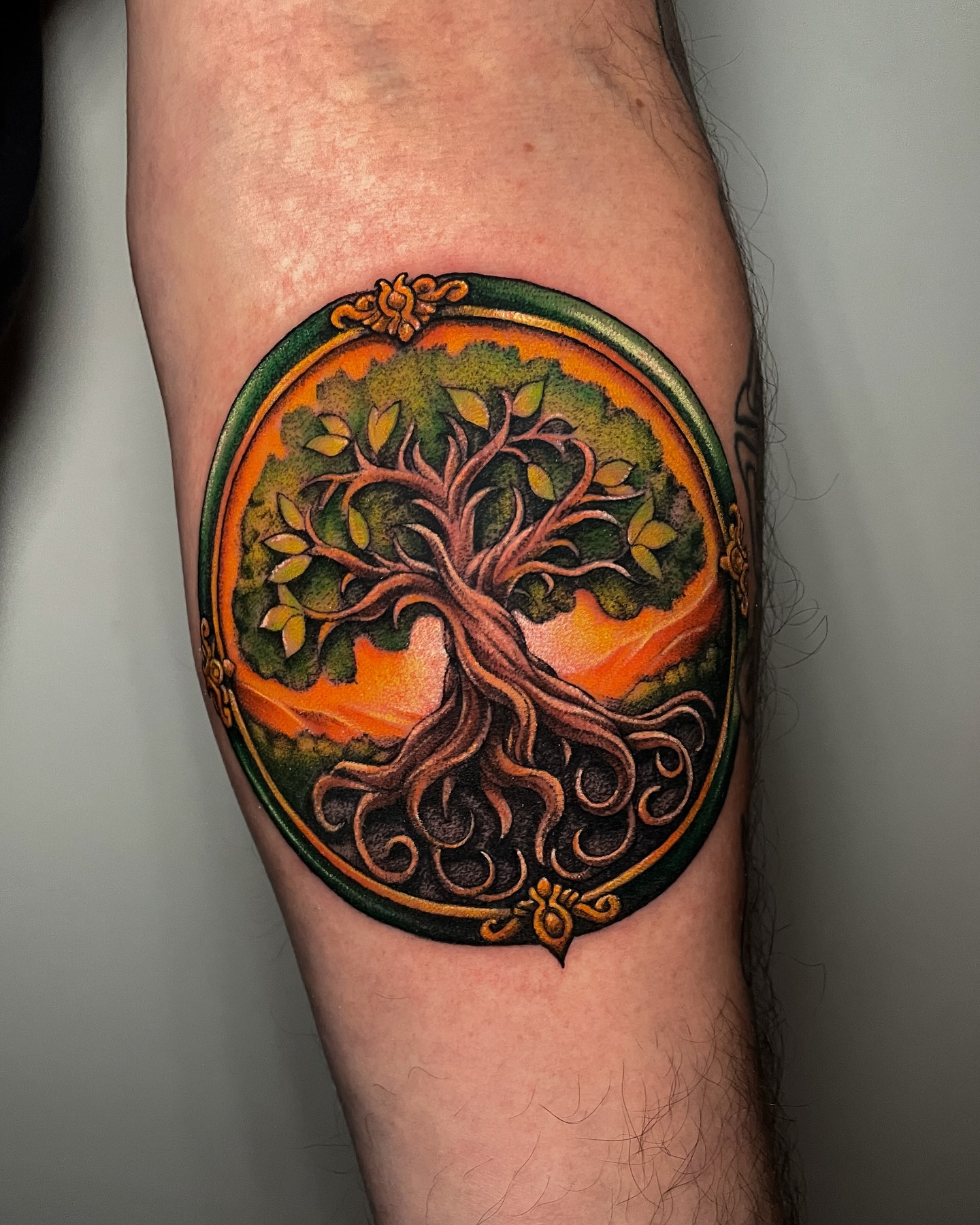 The tattoo features a circular design showcasing a detailed tree with vibrant green leaves and intricate roots.