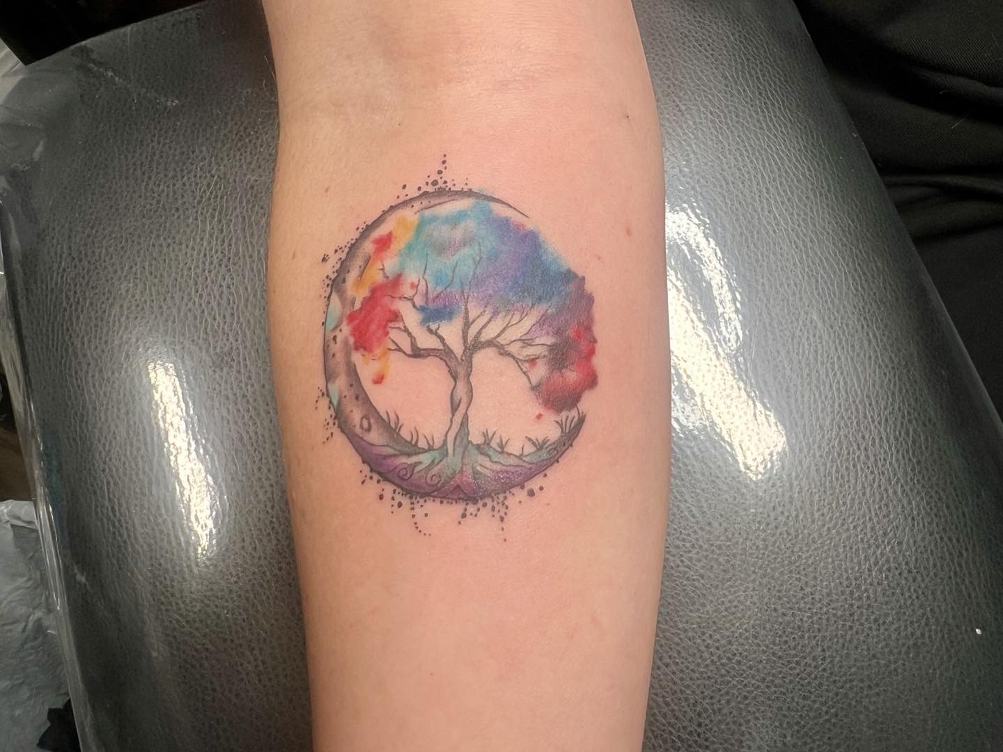 The tattoo features a vibrant tree surrounded by swirling shades of teal and blue, creating a dynamic circular effect.