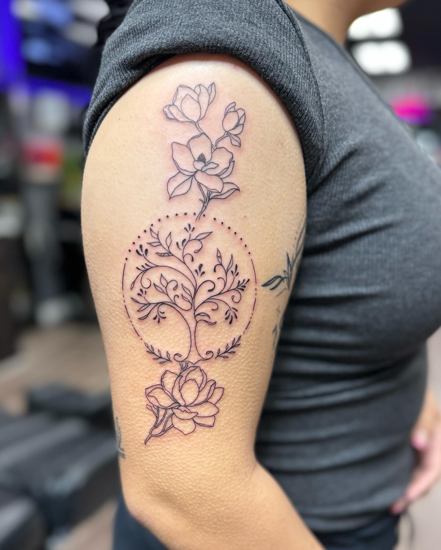 The tattoo features a detailed tree design intertwined with elegant floral elements, creating a harmonious balance between nature and artistry.