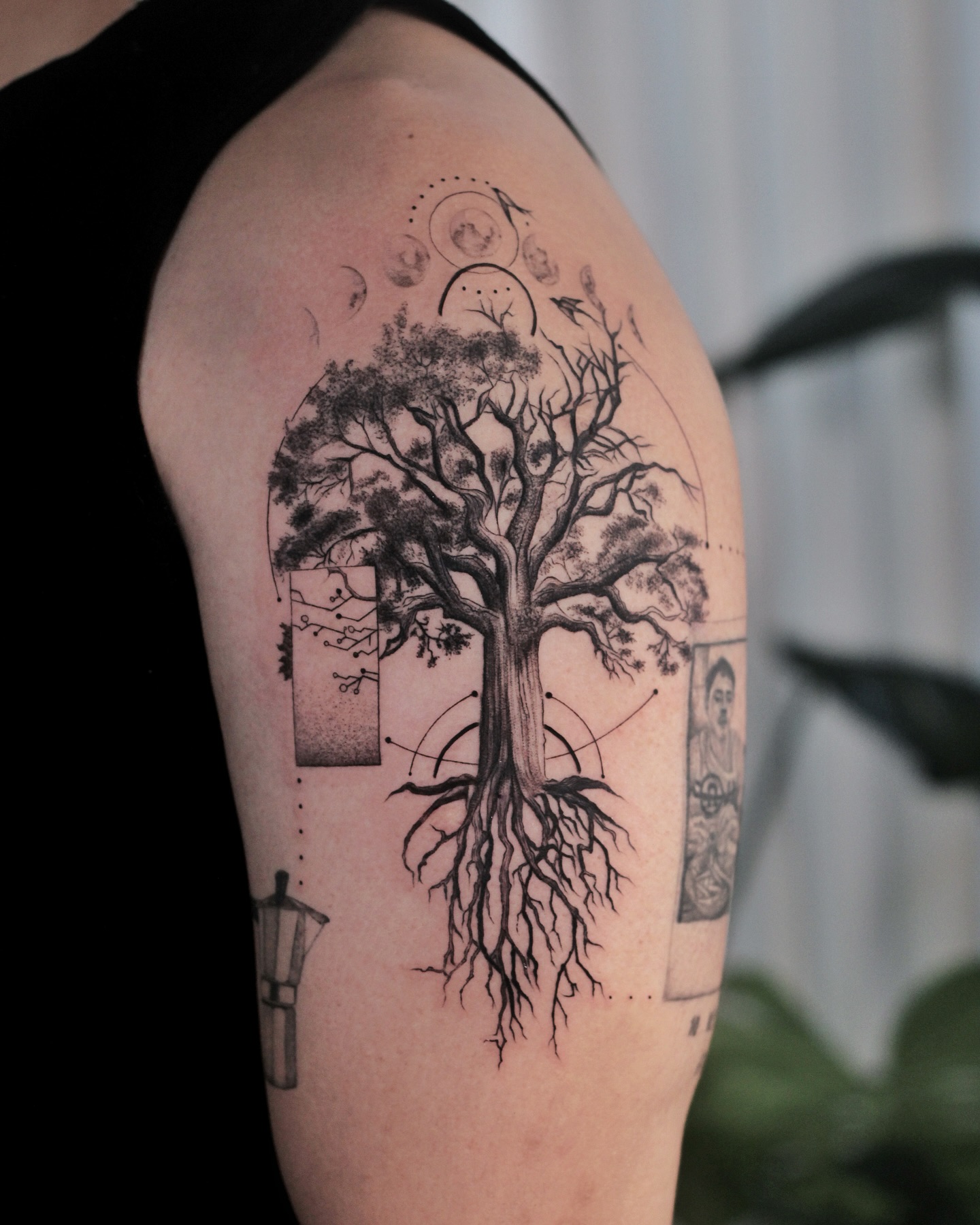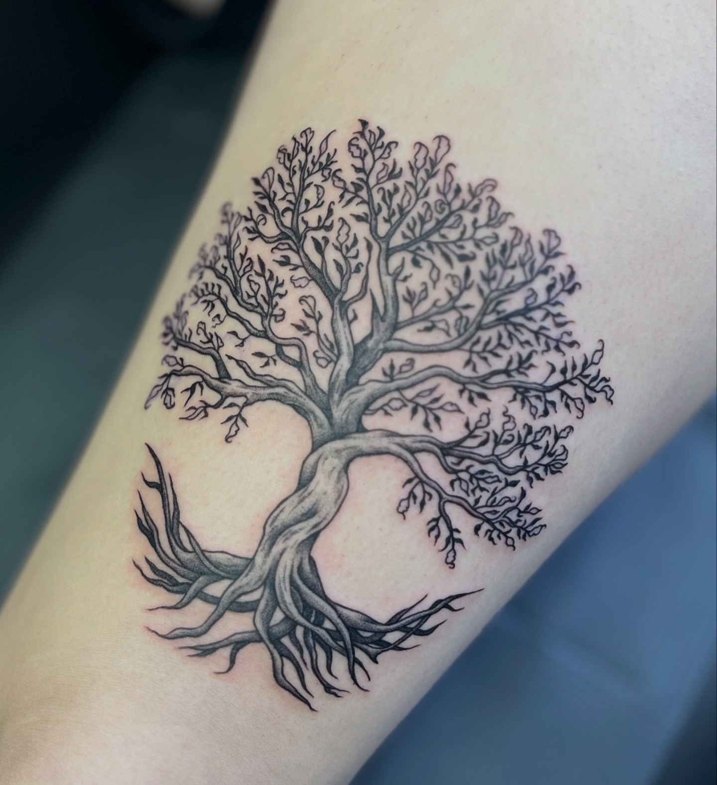The tattoo features a detailed tree with roots and branches that are elegantly intertwined, capturing a sense of growth and connection.