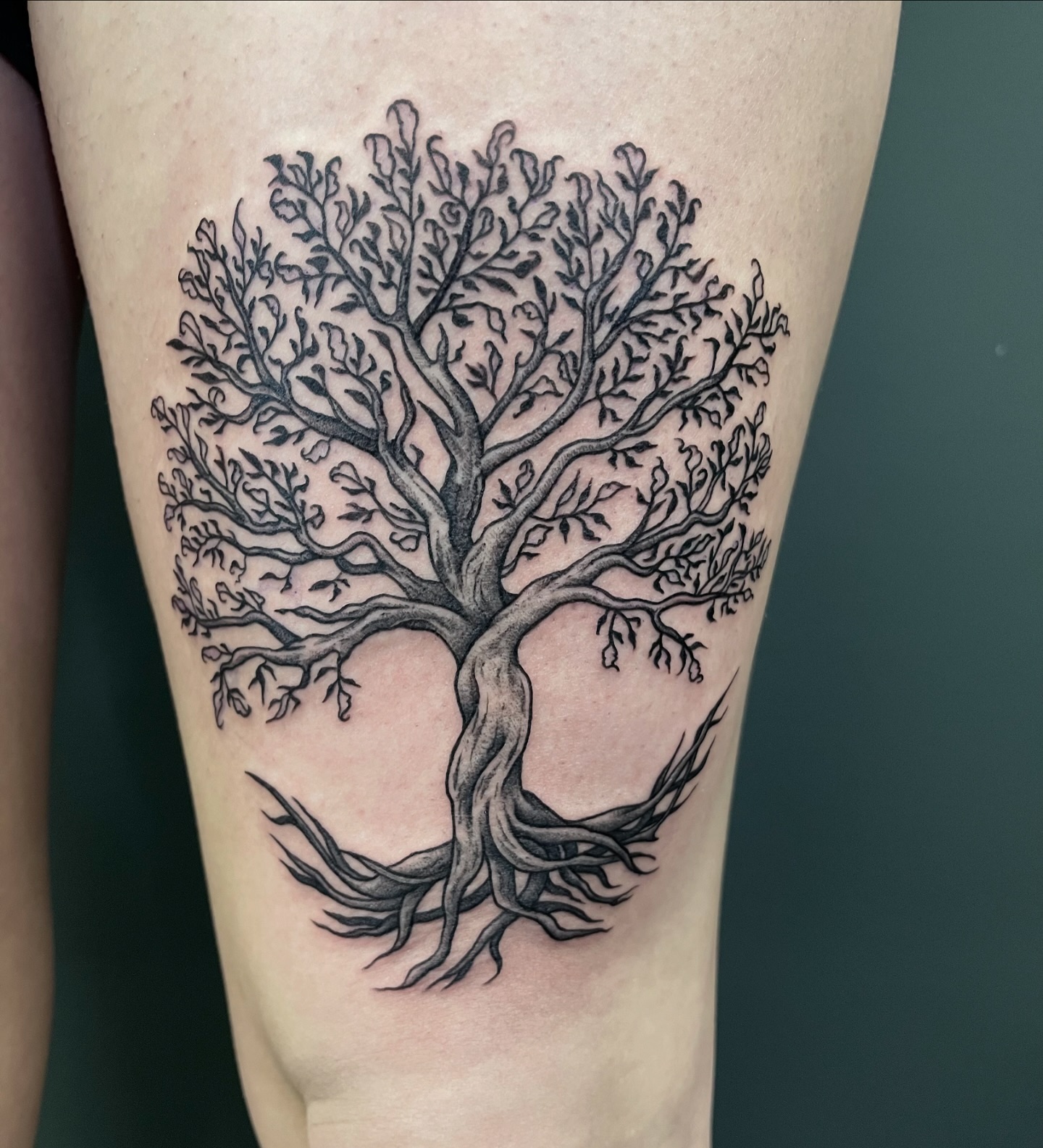 The tattoo features a detailed tree that showcases both roots and branches, emphasizing the connection between life and growth.