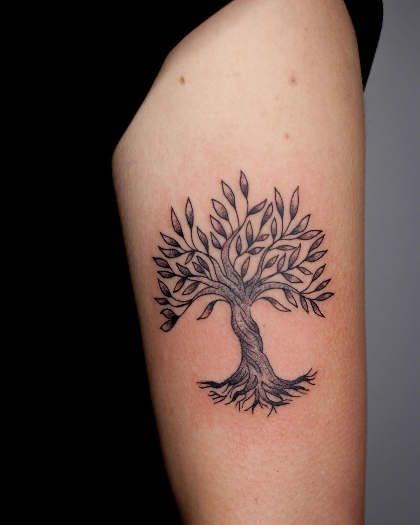 The tattoo features a twisted trunk that elegantly rises to form numerous leafy branches.