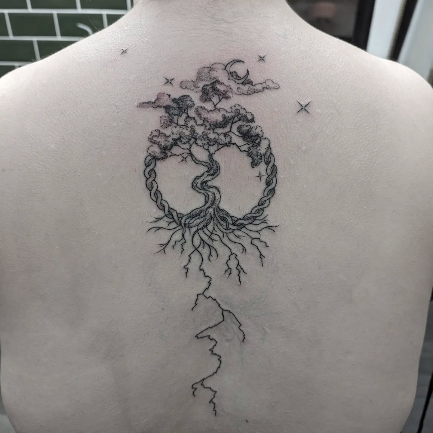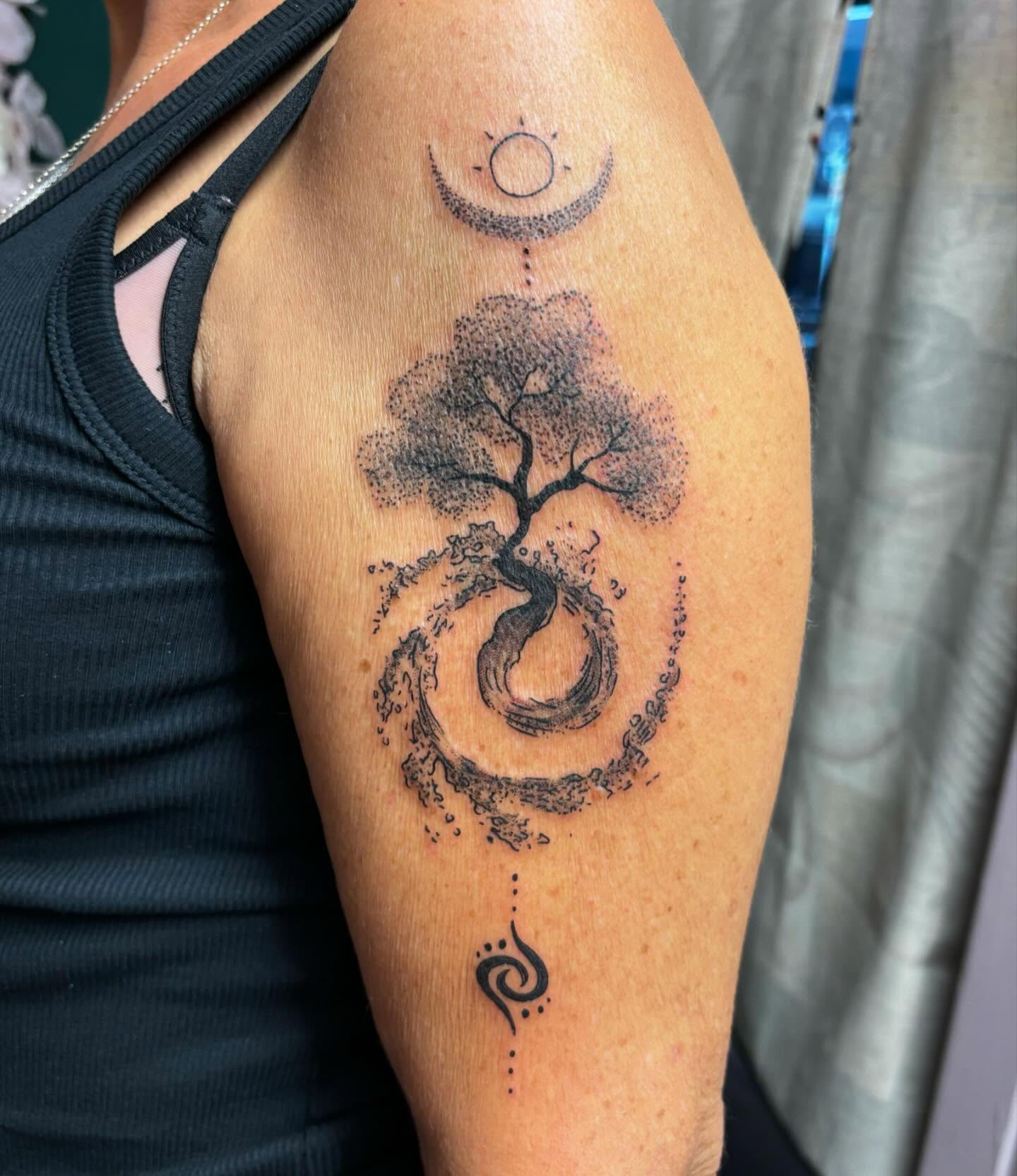 Intricate dot work and shading enhance the tree’s texture, while celestial symbols above it add depth and meaning to the overall composition.