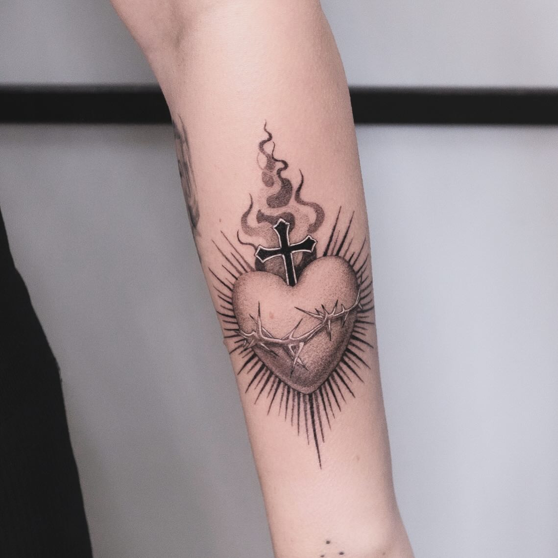 A heart adorned with thorns and a small cross is surrounded by flame-like details and rays of light.