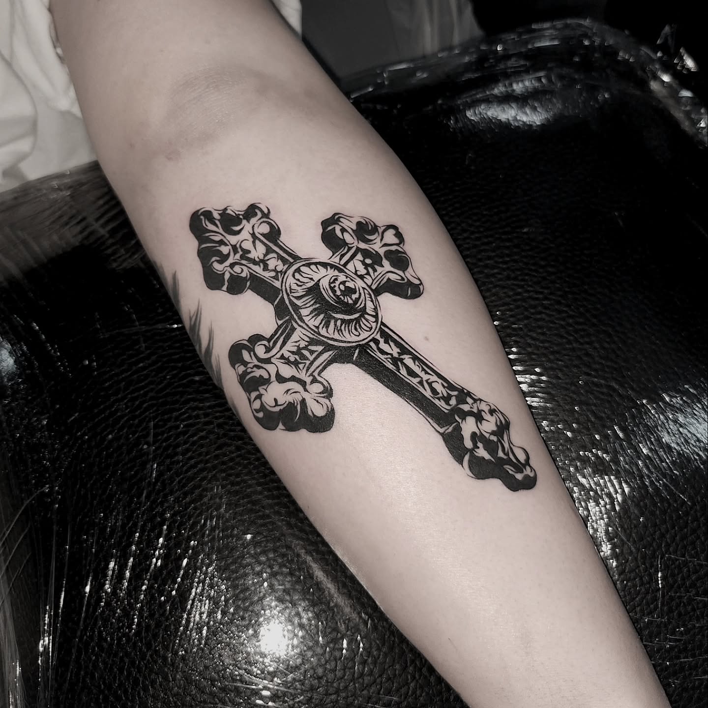 The tattoo features an intricately designed cross with decorative ends and a central eye motif.