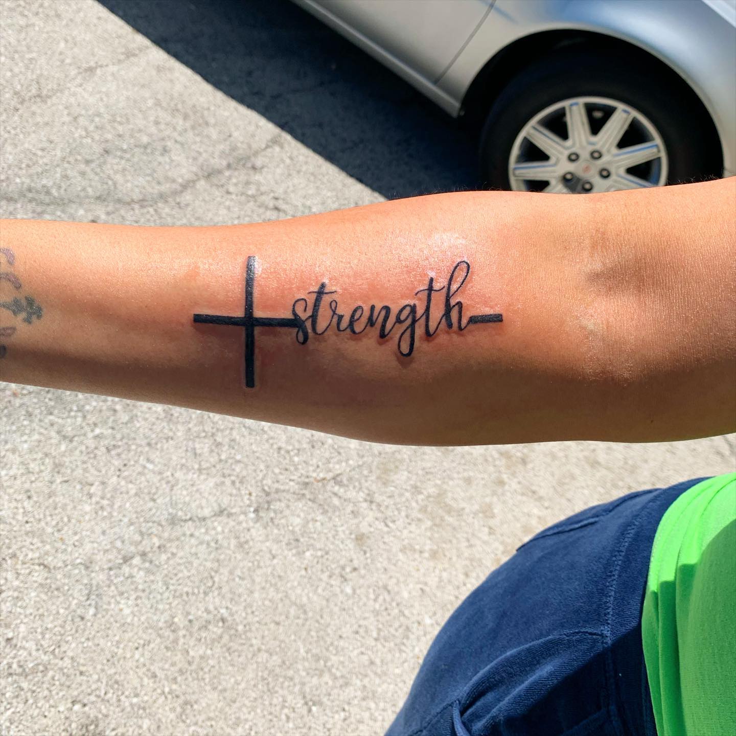 The tattoo features a bold black cross integrated with the word “strength” in a flowing script.