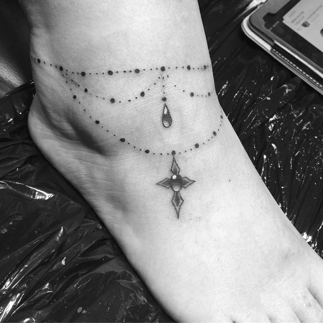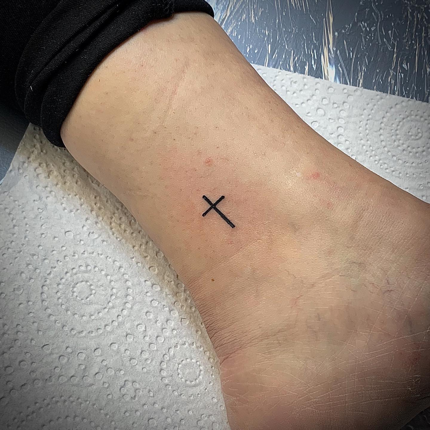 A small, simple cross tattoo is placed delicately on the ankle, emphasizing its understated elegance.