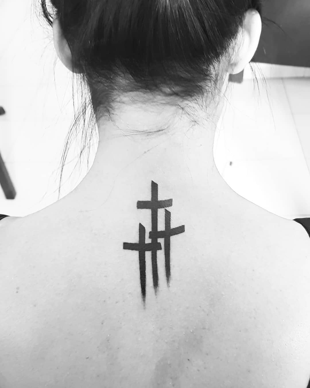 This tattoo features a unique arrangement of vertical crosses that create a striking focal point on the back.