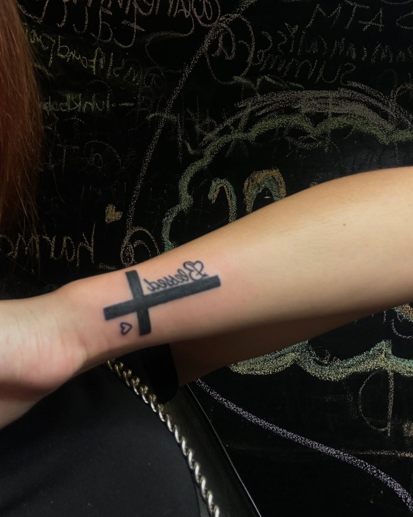 The tattoo features a bold black cross accompanied by the word “blessed” in a cursive font, topped with a small heart.
