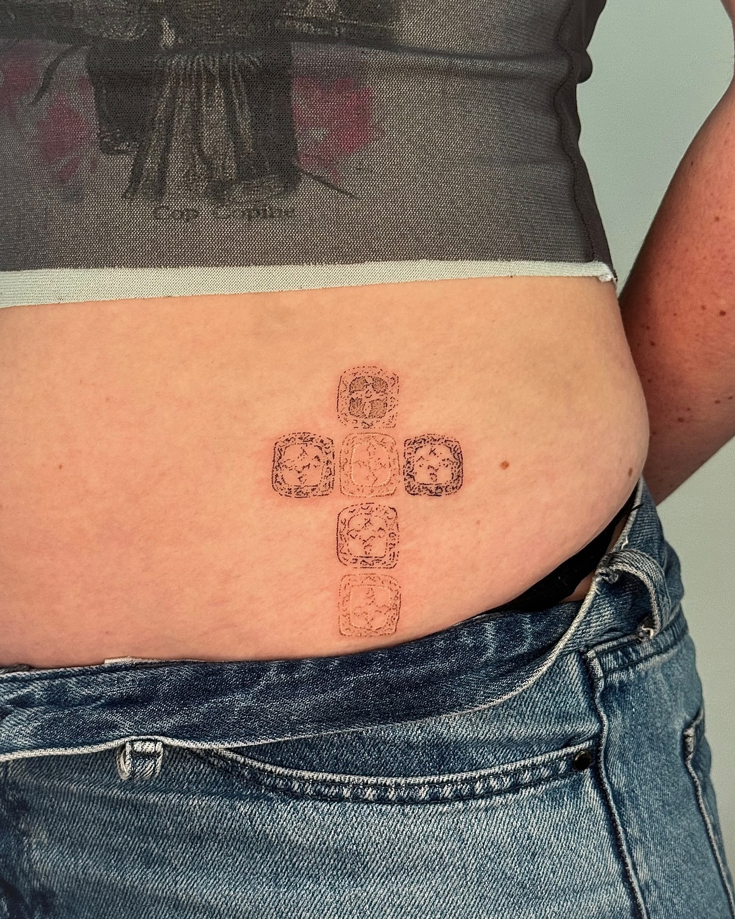 The tattoo features a geometric cross made up of square shapes that have intricate textures within them.