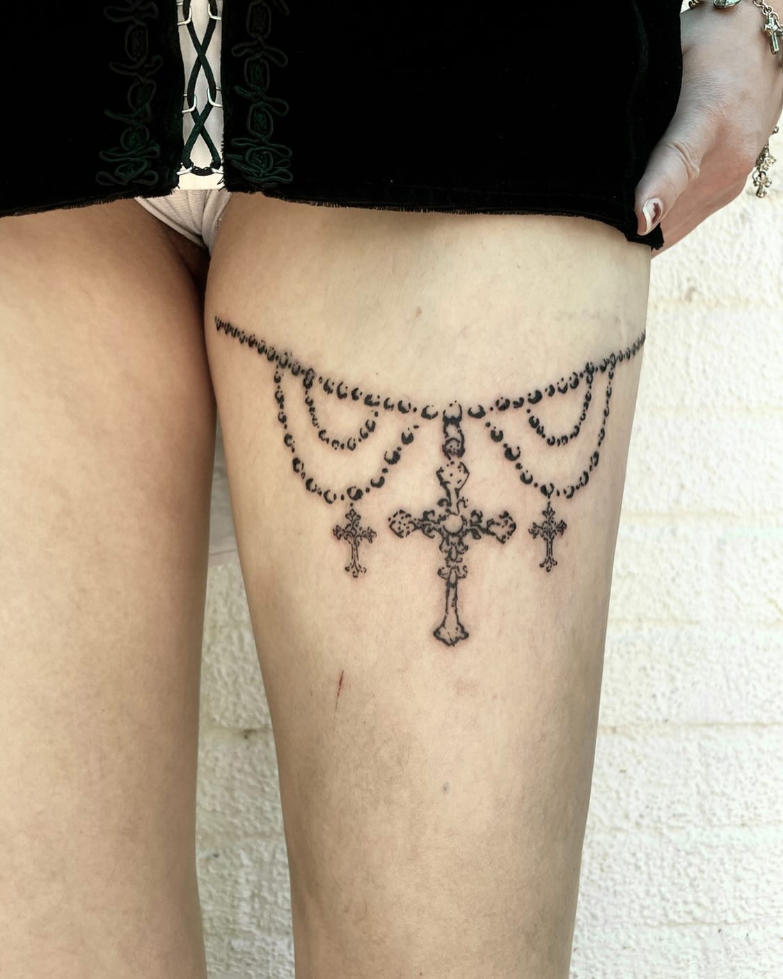 The tattoo features a detailed cross design adorned with delicate beaded chains cascading down the thigh.