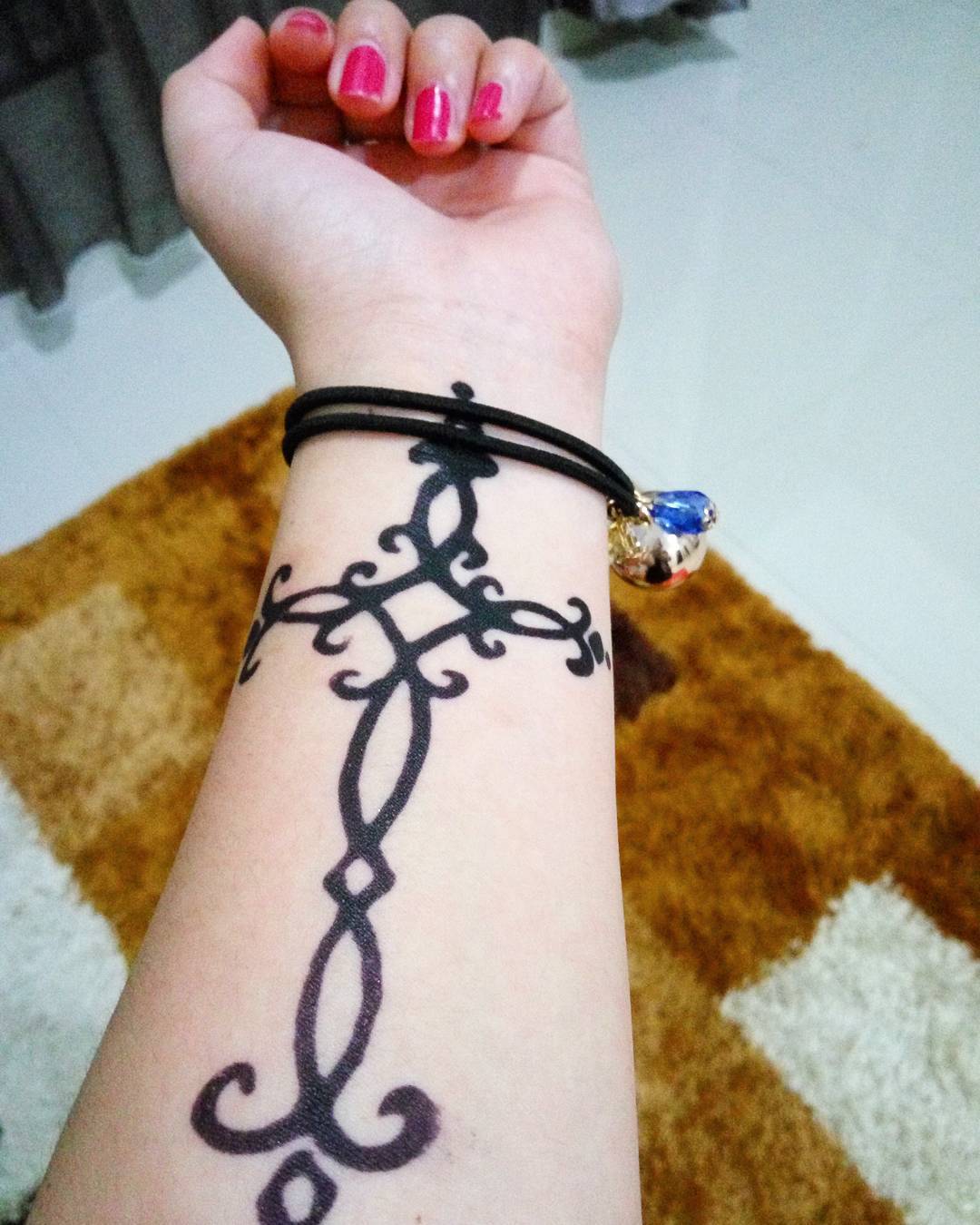 The tattoo features a large, intricate black cross that combines flowing lines and elegant curves.