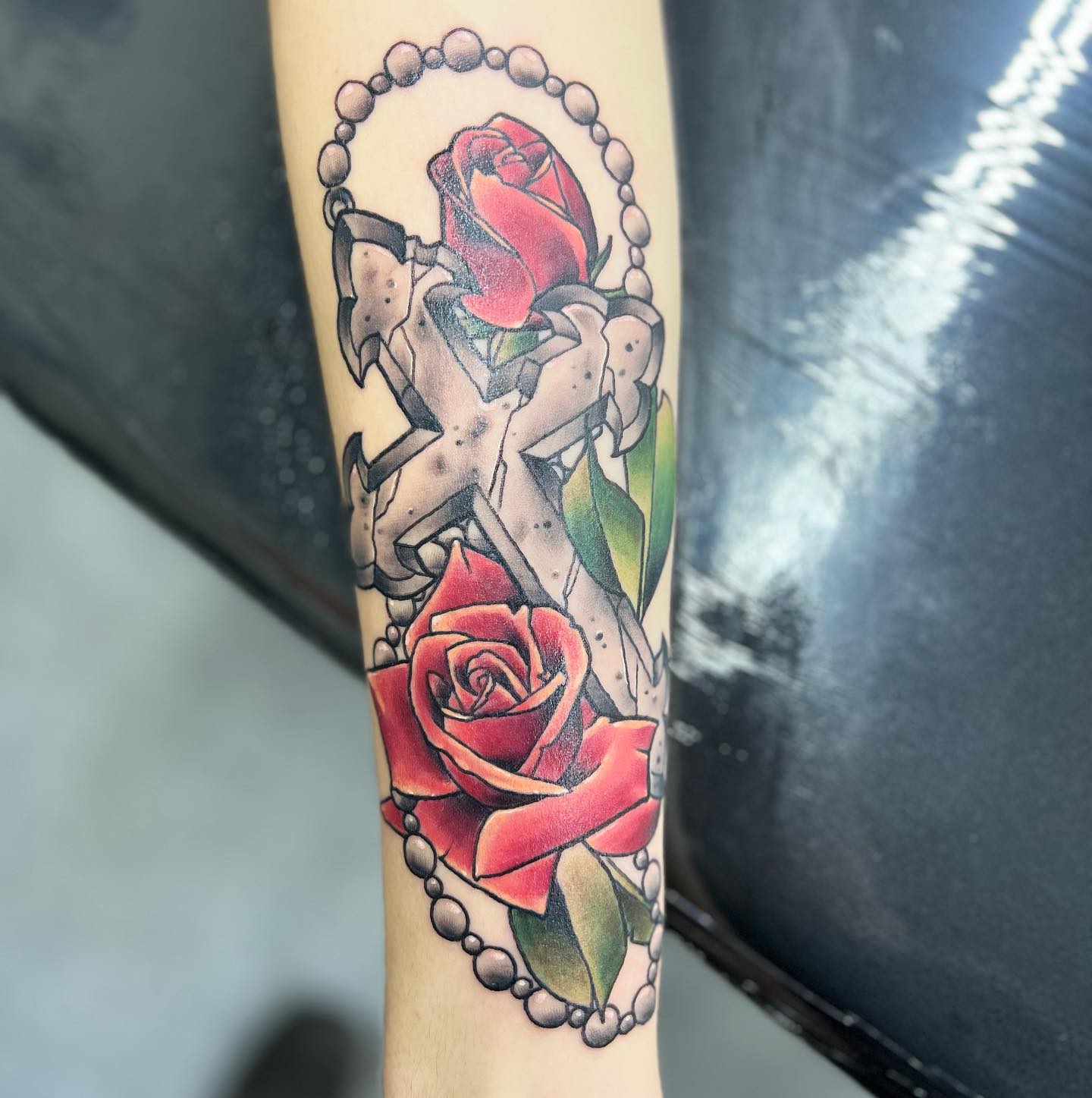 The tattoo features a prominent black cross adorned with detailed roses, creating a striking contrast.
