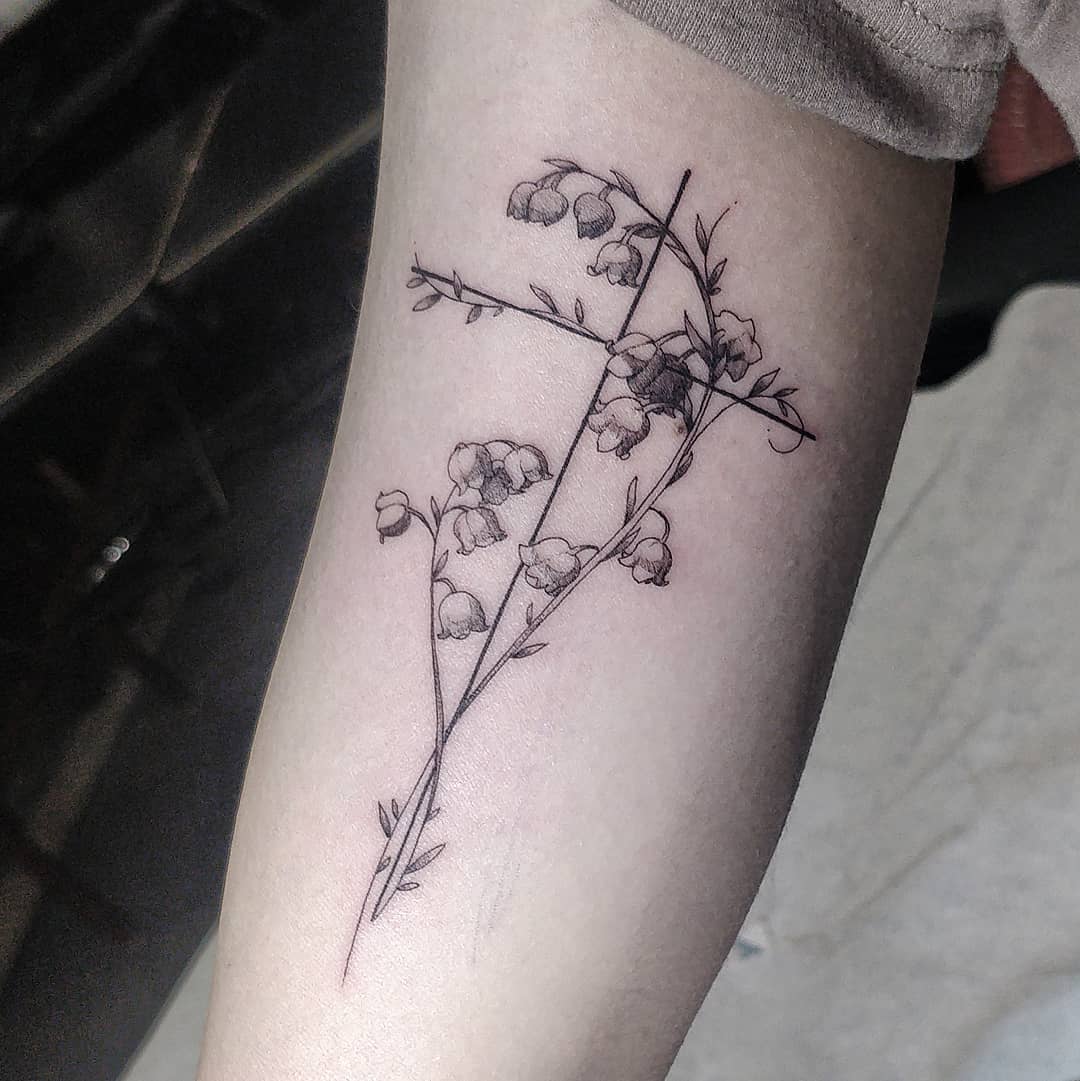 The tattoo features a delicate floral arrangement that forms a cross shape, with fine lines creating a vertical stem.