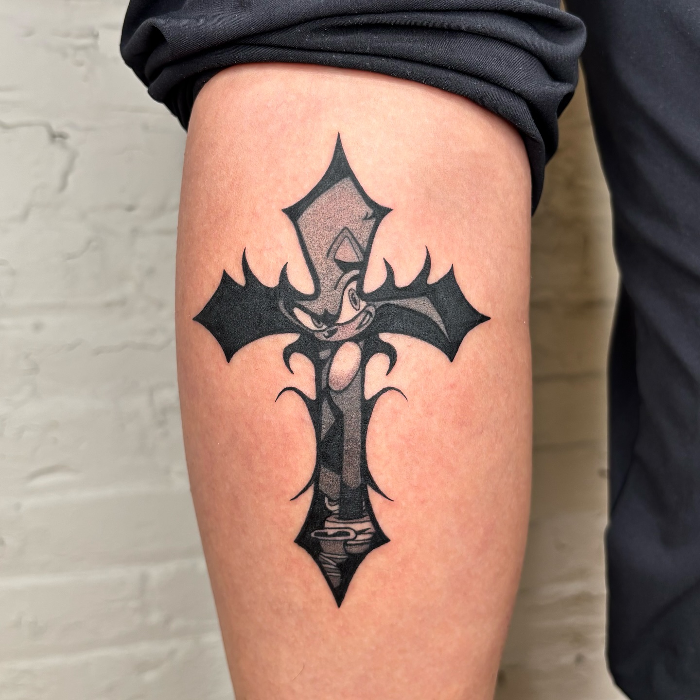 The tattoo features a bold cross design with sharp, defined edges and a central figure that adds depth.