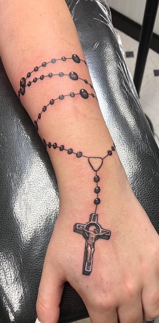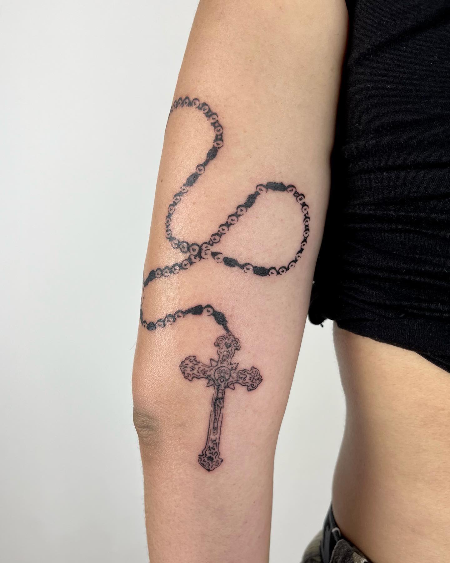 The tattoo features a detailed cross surrounded by a flowing rosary chain.