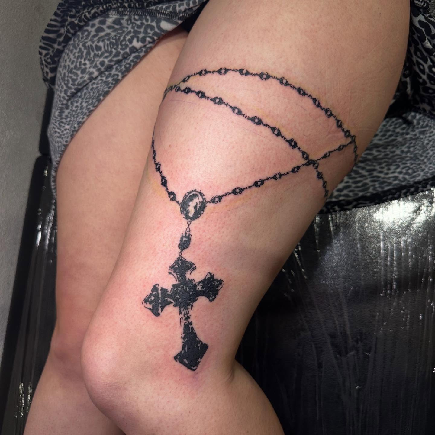 A cross tattoo is intricately connected with delicate beads forming a rosary that wraps around the thigh.