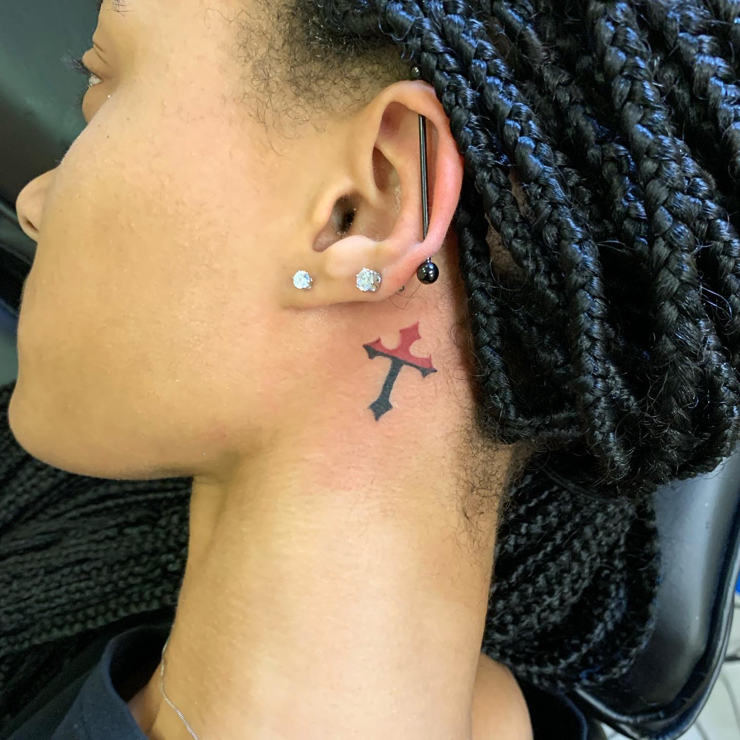 The tattoo features a striking cross design positioned neatly on the side of the neck.
