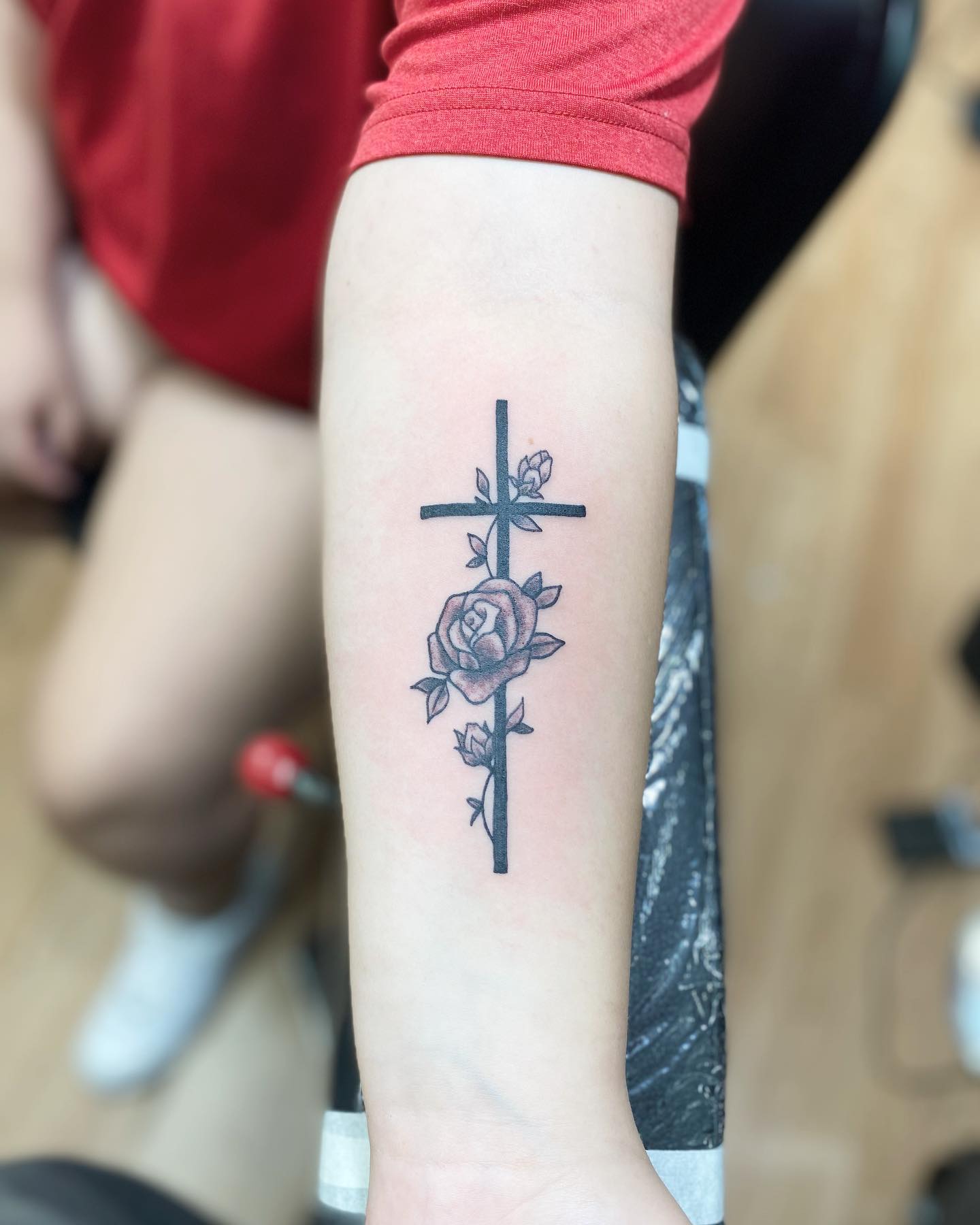 The tattoo features a bold black cross intertwined with delicate roses, creating a striking contrast.