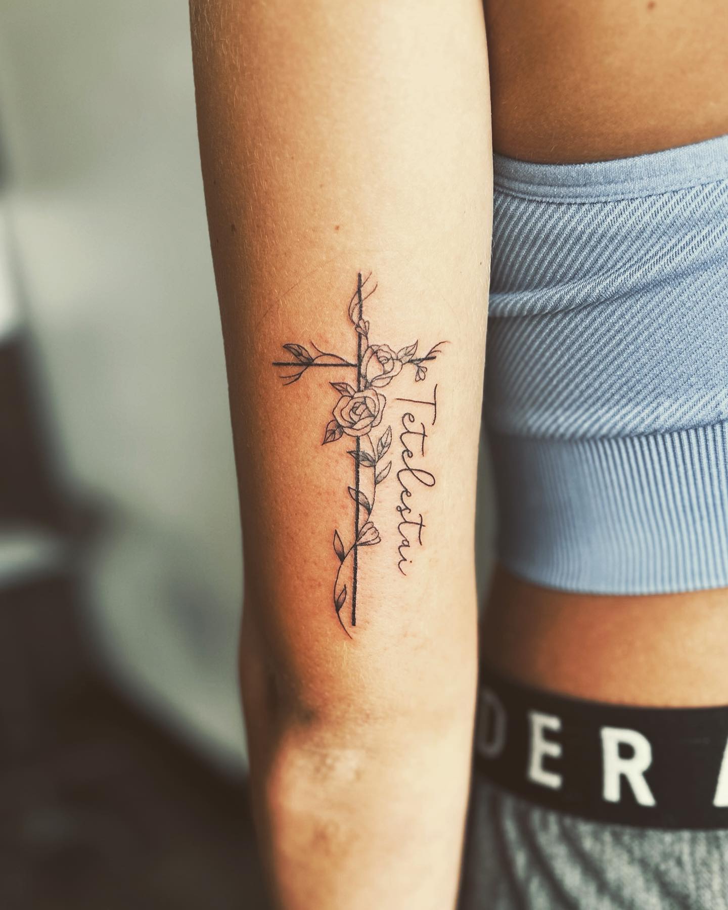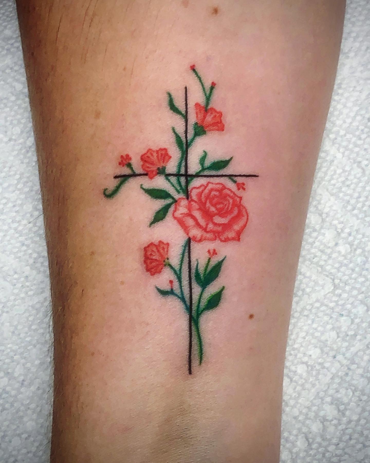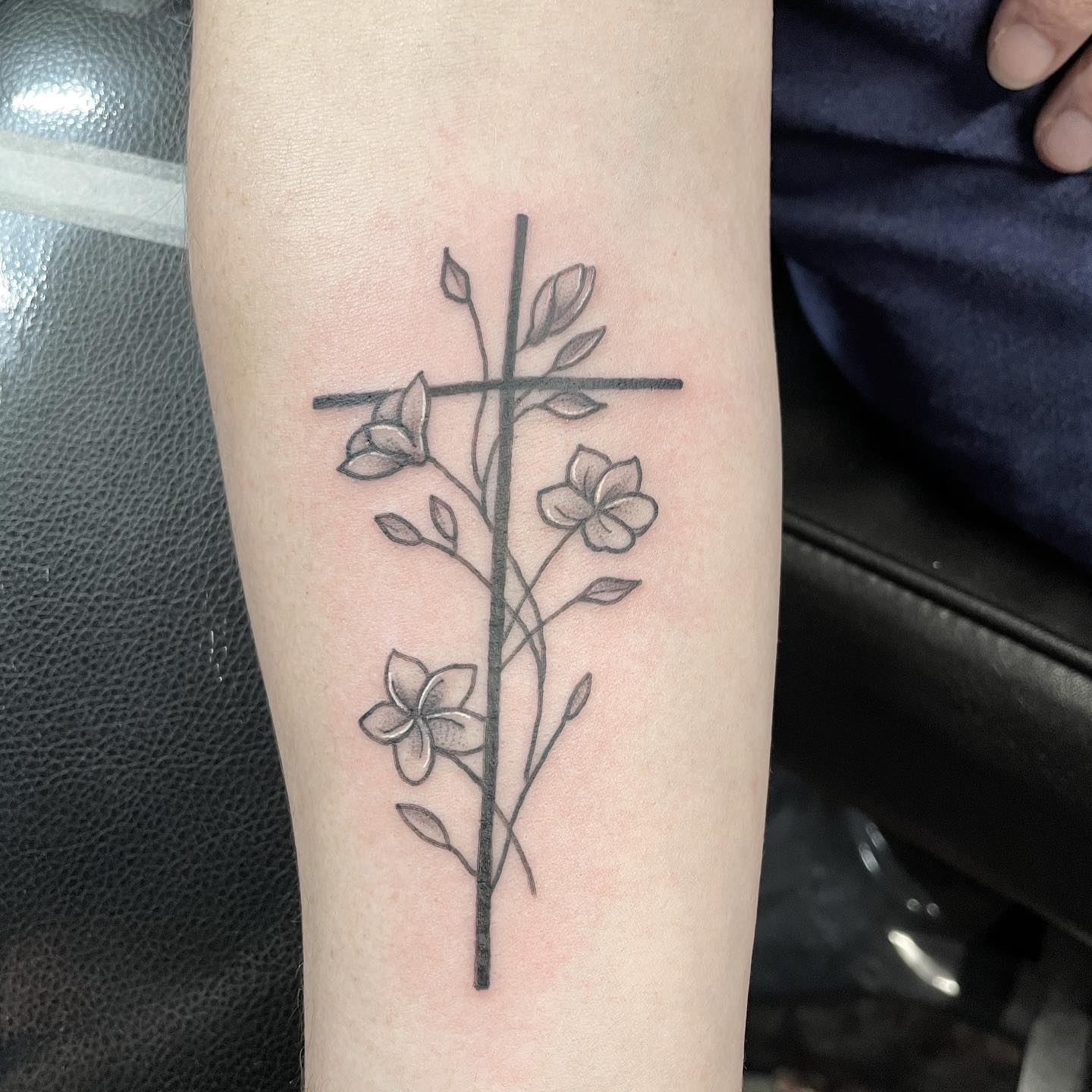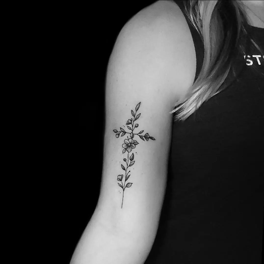 The tattoo features a delicate cross intertwined with a graceful floral arrangement.