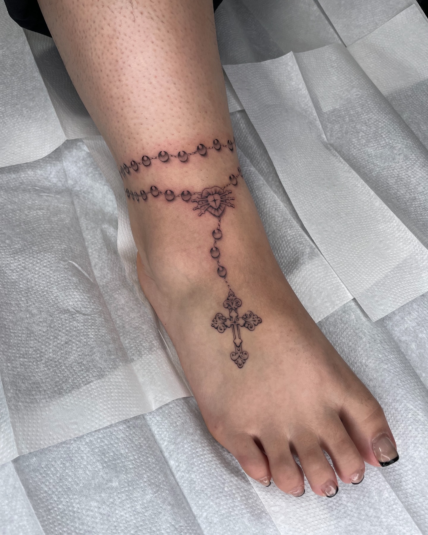 The tattoo features a delicate rosary design that wraps around the ankle, highlighted by a central cross.