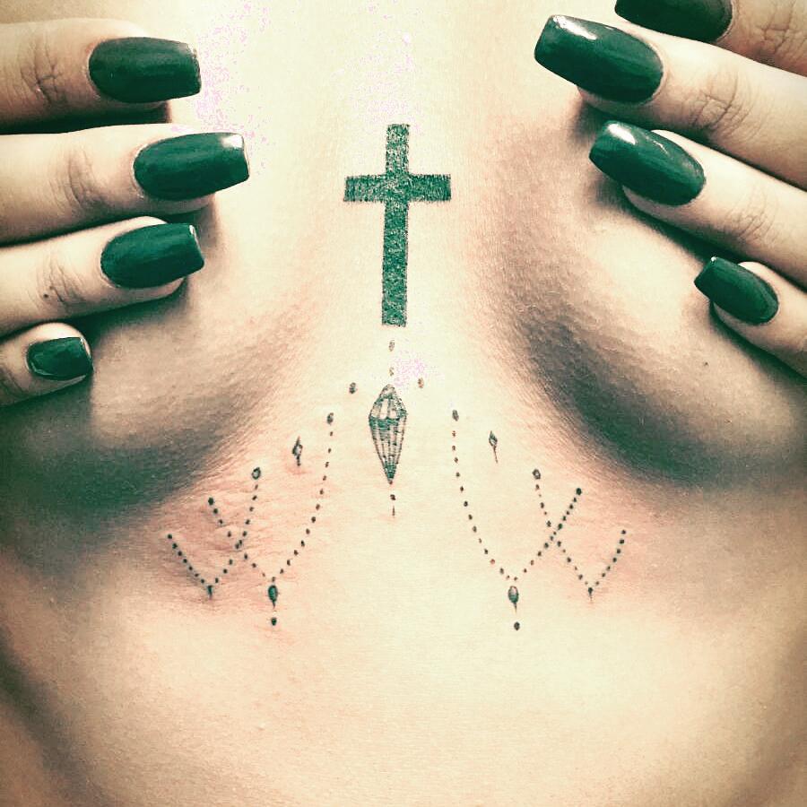 The tattoo features a prominent vertical cross at the center, surrounded by intricate decorative patterns.