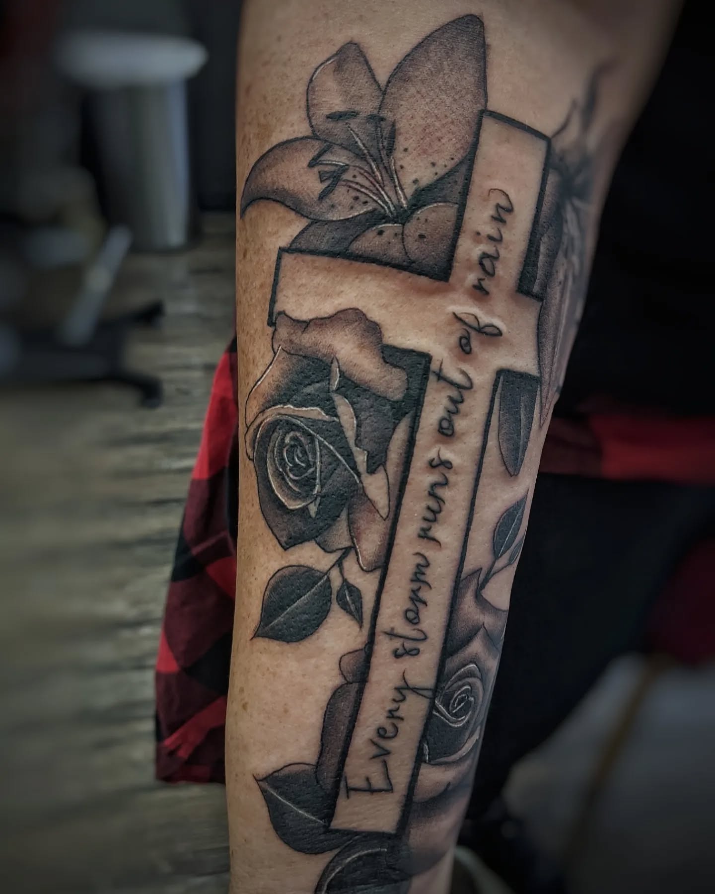Fine line techniques create a soft, elegant look, allowing the flowers and cross to blend harmoniously together.