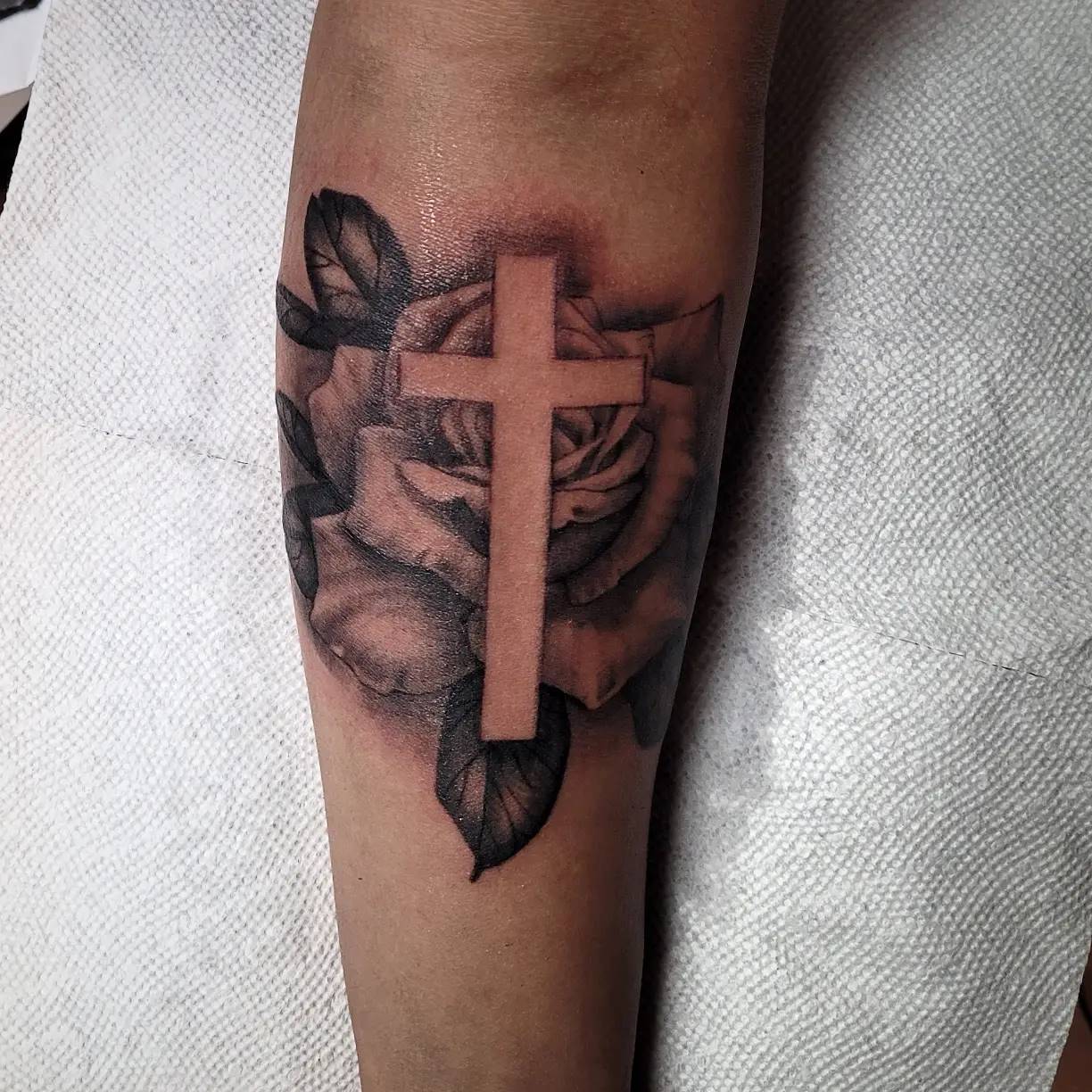 The tattoo features a prominent cross set against a detailed rose, creating a striking contrast between the two elements.