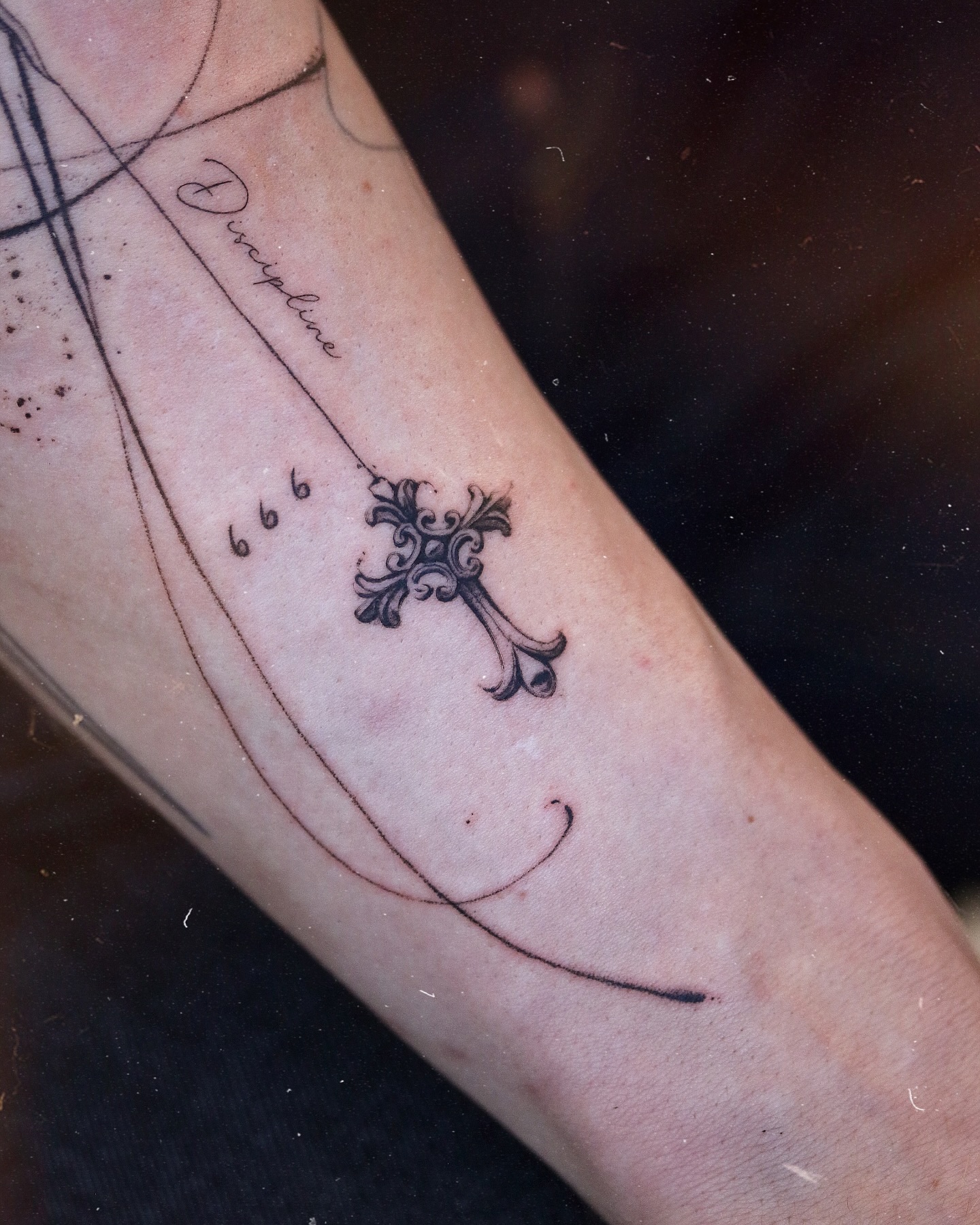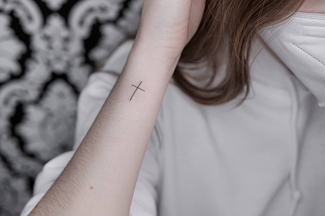 A simple black cross inked on the inner forearm highlights a clean and understated style.