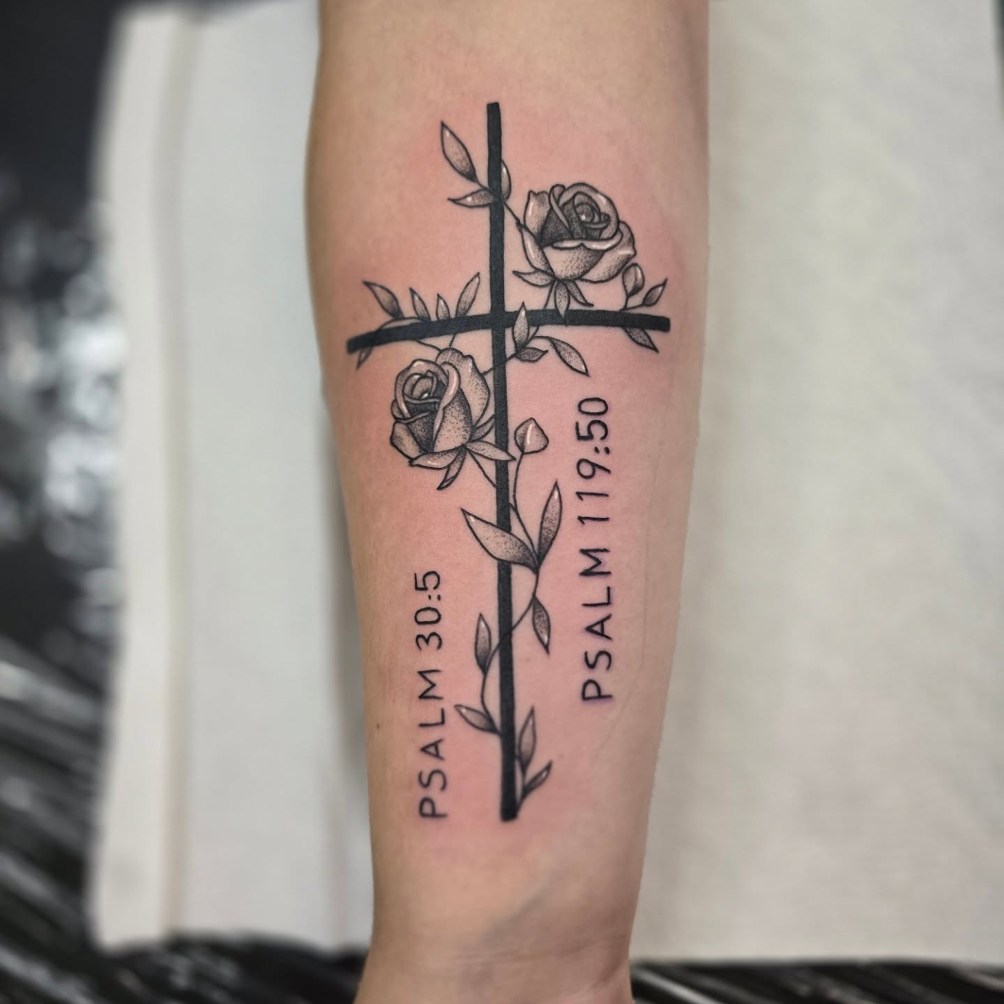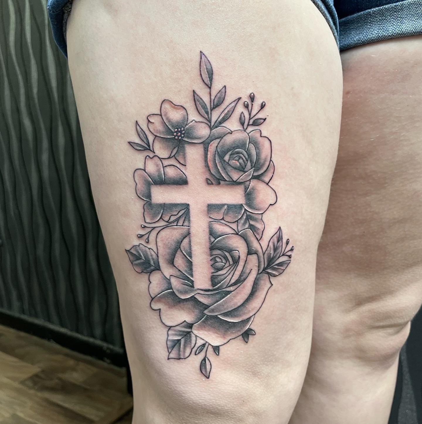 The tattoo features a central cross framed by delicate roses and leaves, creating a harmonious blend of spirituality and nature.