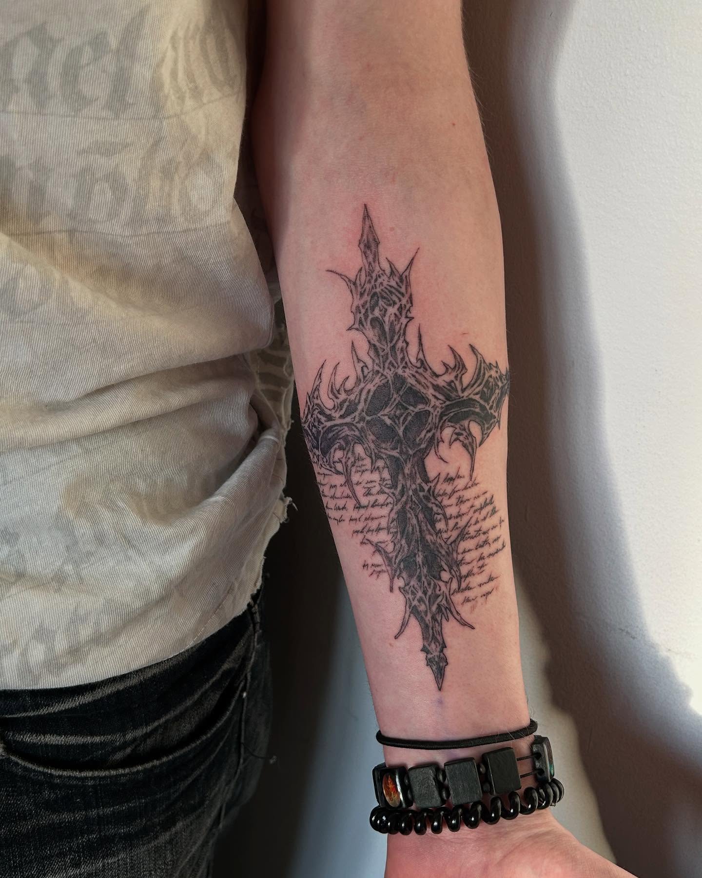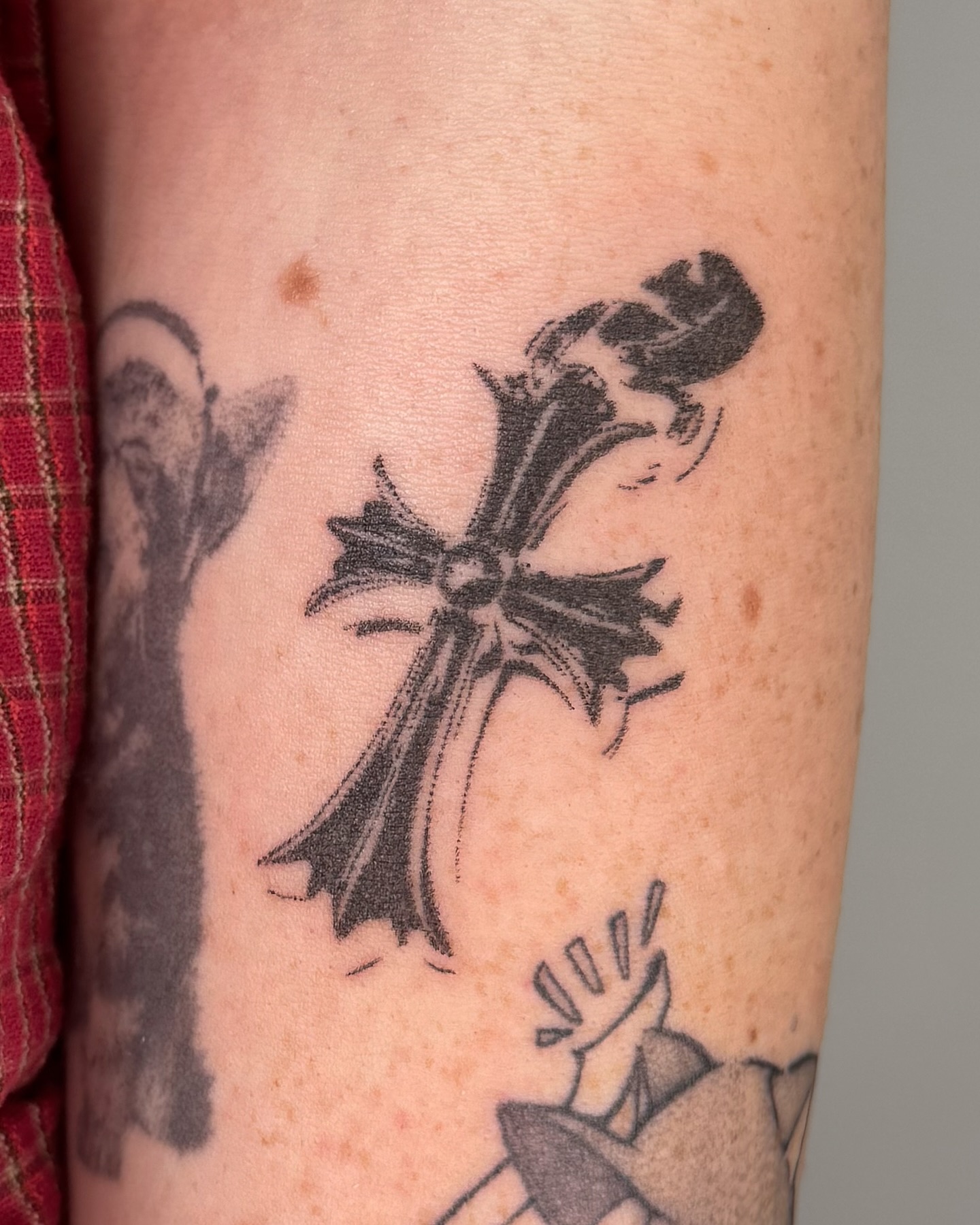 The tattoo features an elaborate cross design, distinguished by its sharp edges and intricate patterns that create a striking visual impact.