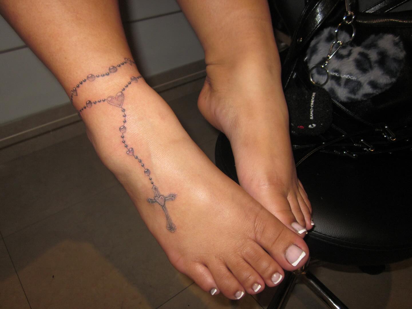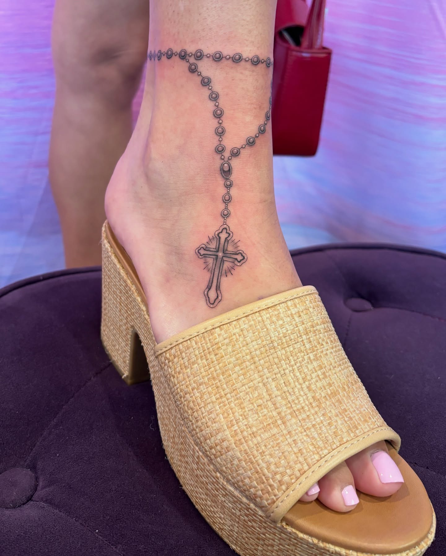 The tattoo features a detailed cross connected by a string of rosary beads wrapping around the ankle.