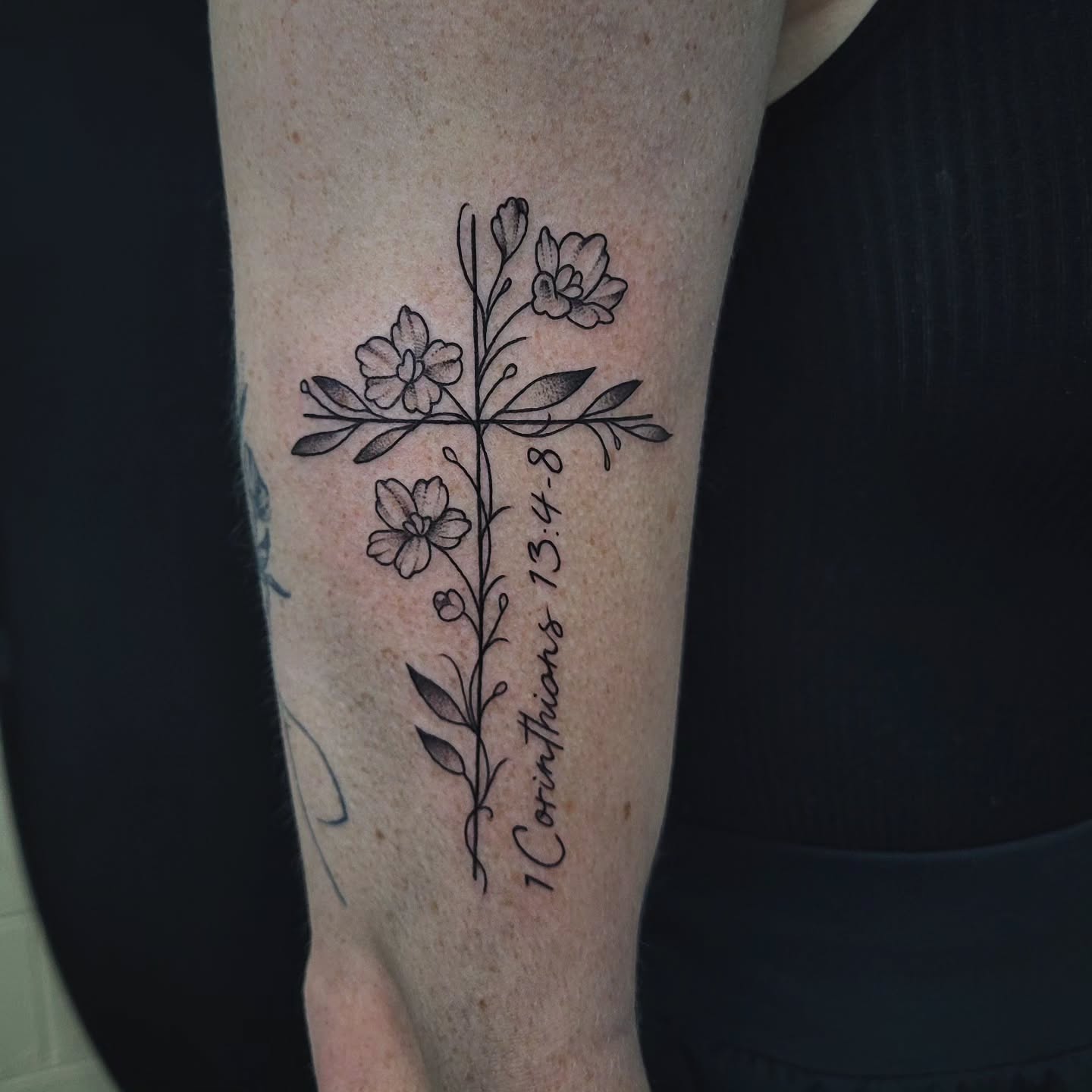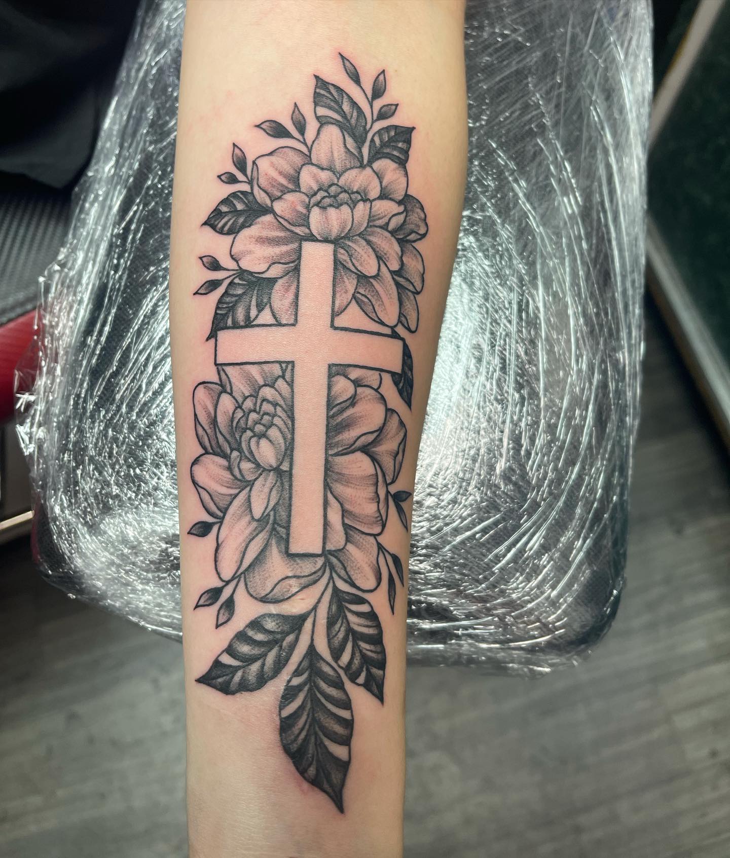 The tattoo features a cross intertwined with delicate flowers and leaves, creating a harmonious blend of nature and faith.