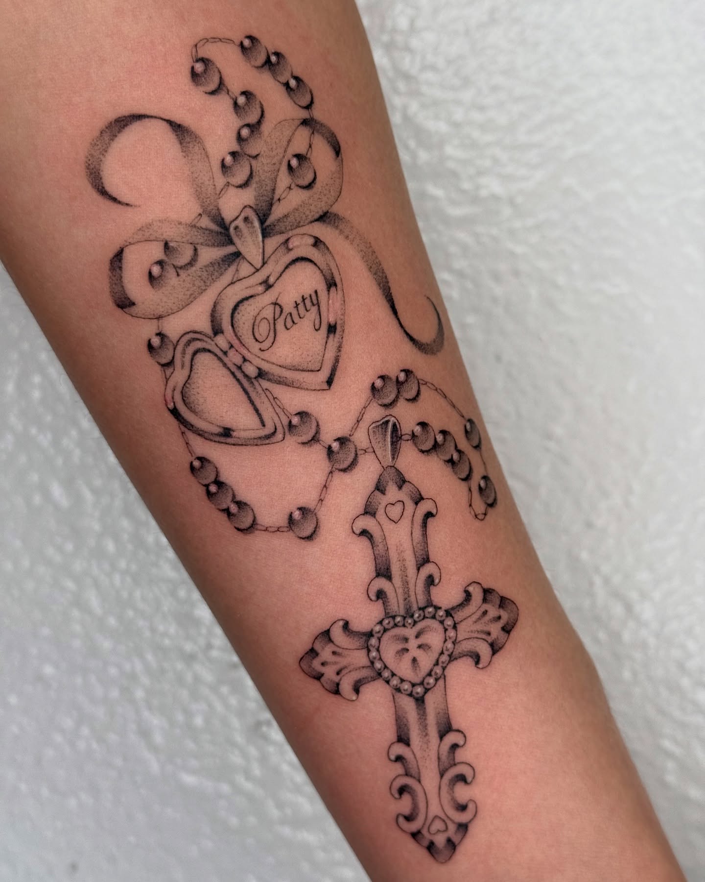 The tattoo features a detailed cross adorned with a heart and surrounded by a string of beads.