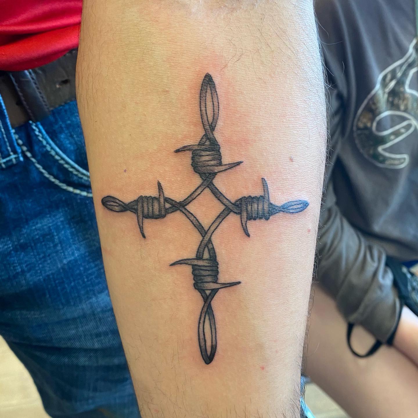 The tattoo features a unique cross design made from barbed wire, creating a striking visual impact.