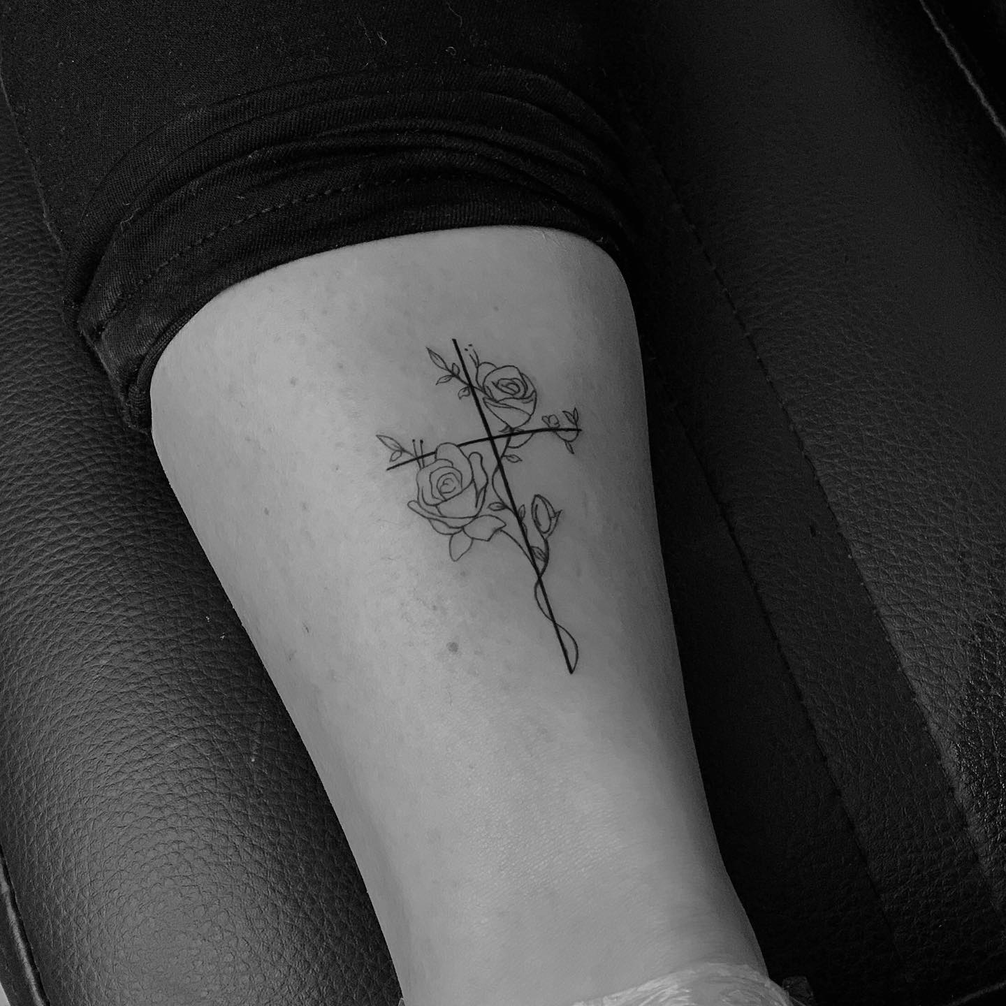 The tattoo features a simple cross entwined with elegantly drawn roses.