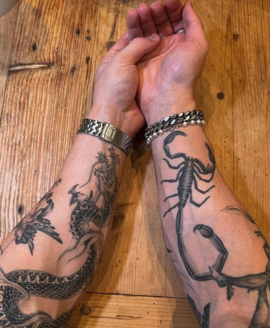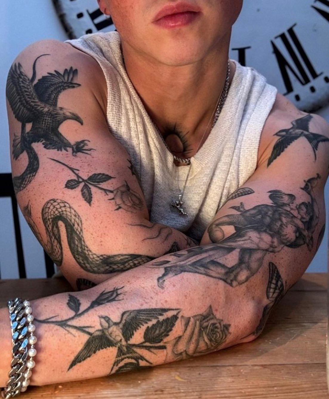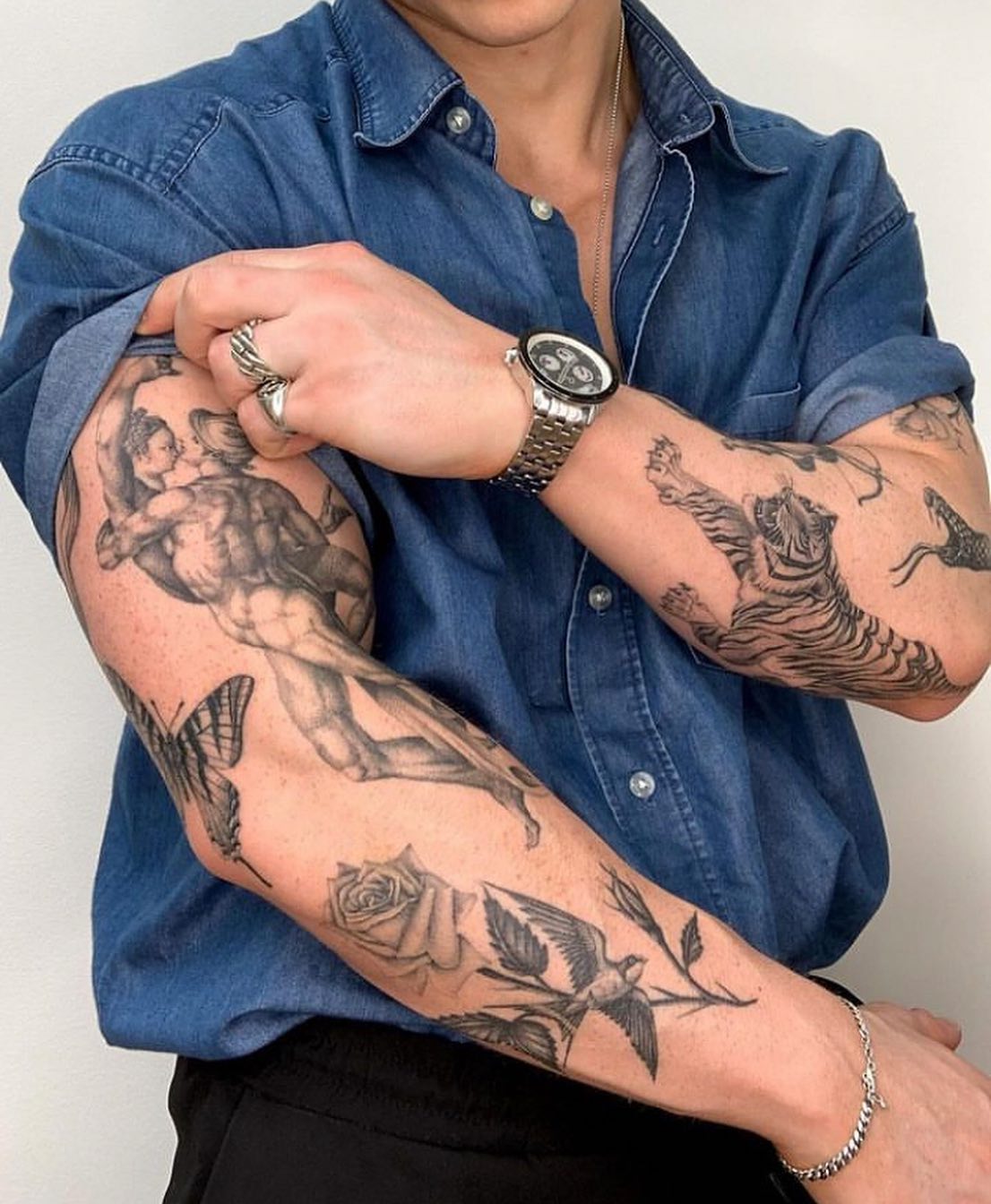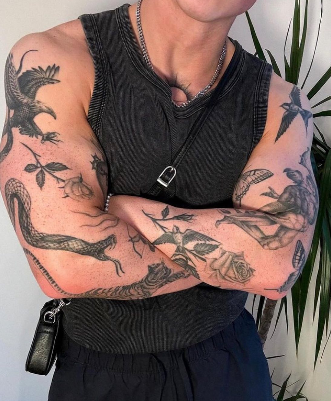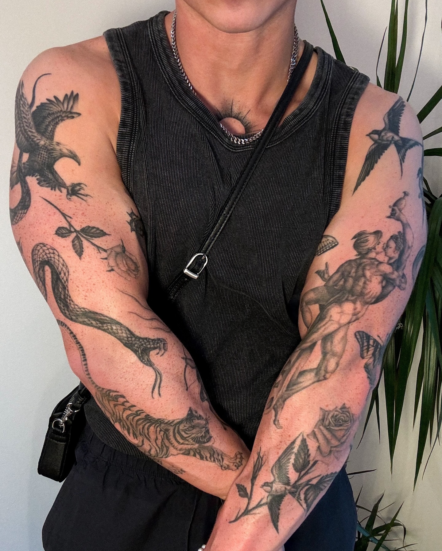 This image showcases a blend of striking tattoos that tell a unique story across both arms. Featuring everything from fierce animals to delicate flowers, these designs create a captivating patchwork effect that reflects the wearer’s personality and experiences. For anyone considering a similar style, mixing various themes can turn body art into a powerful form of self-expression.