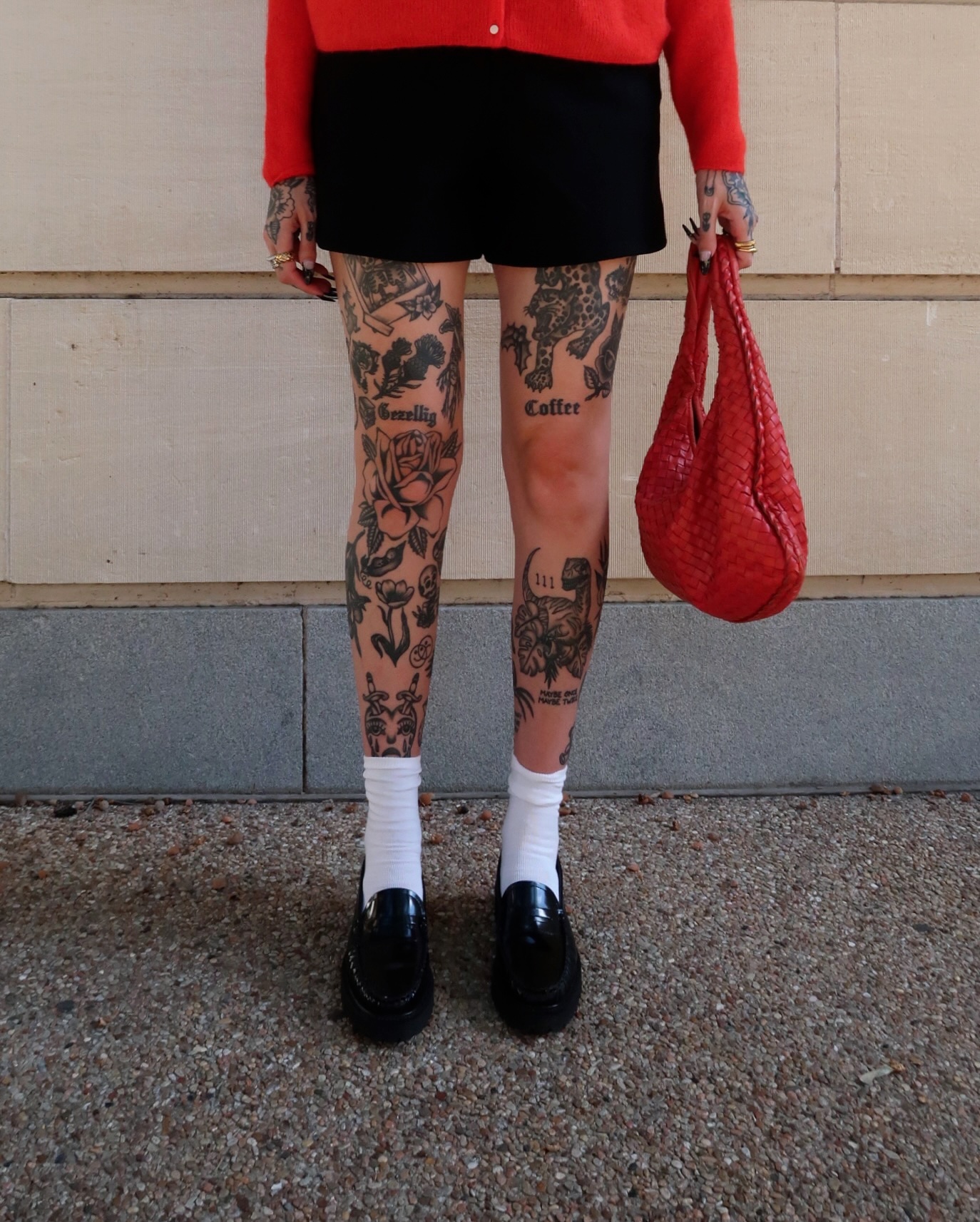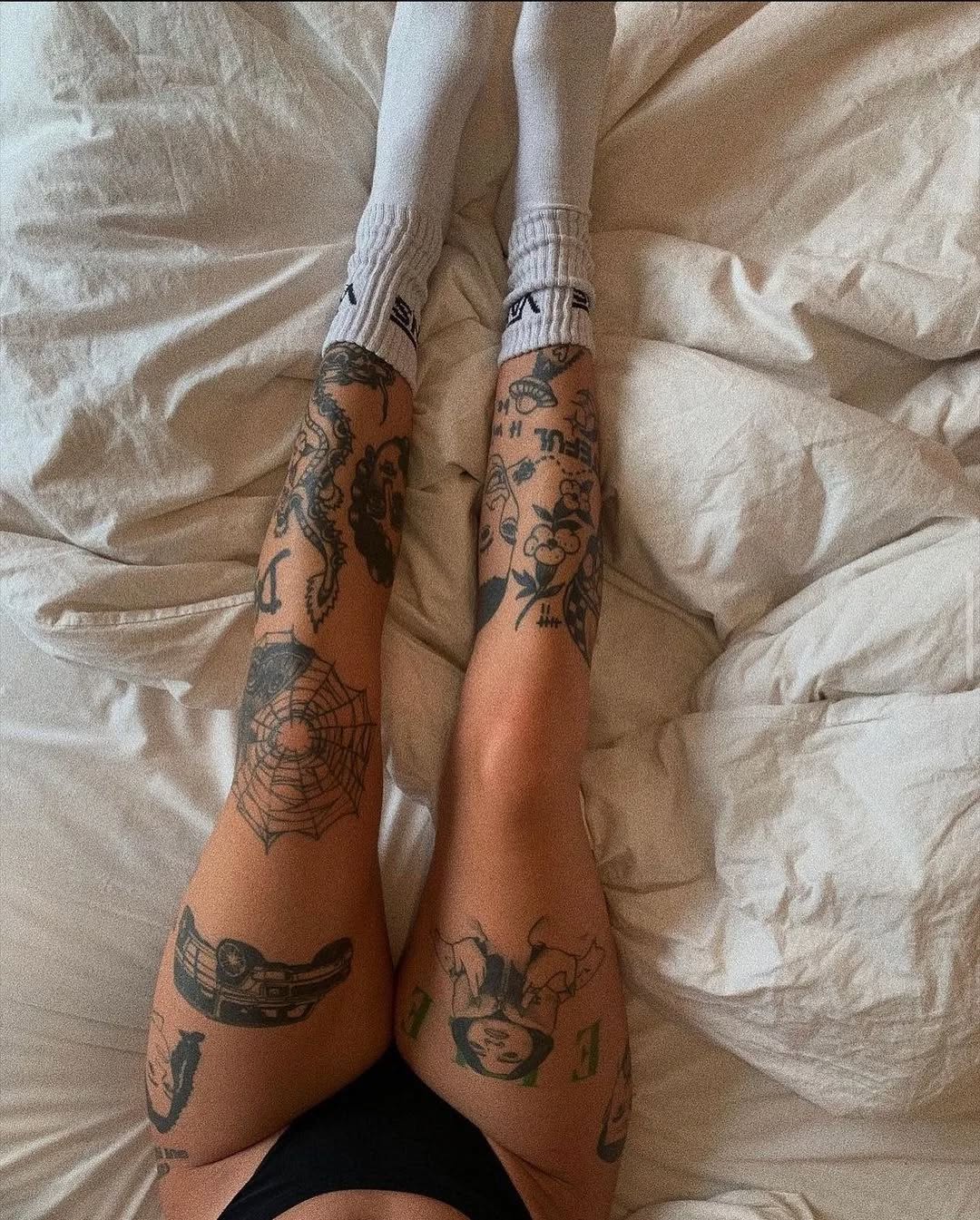 This image showcases a vibrant display of tattoos that tell unique stories across the legs. Each design, from playful florals to striking portraits, adds a personal touch, creating an eye-catching patchwork of artistry. When considering getting a tattoo, think about how different elements can combine to reflect your own journey and interests.