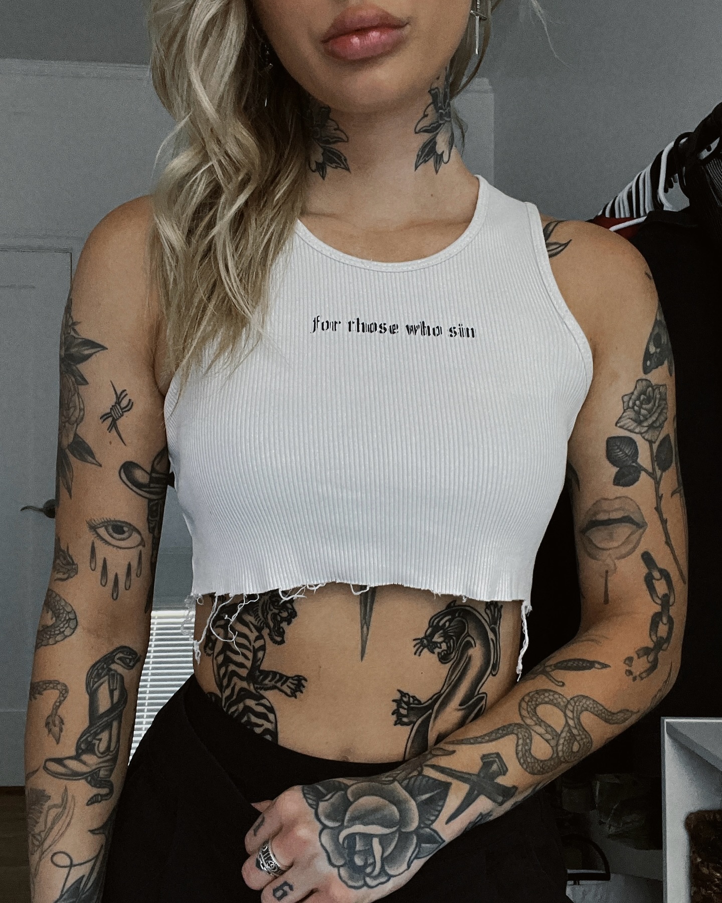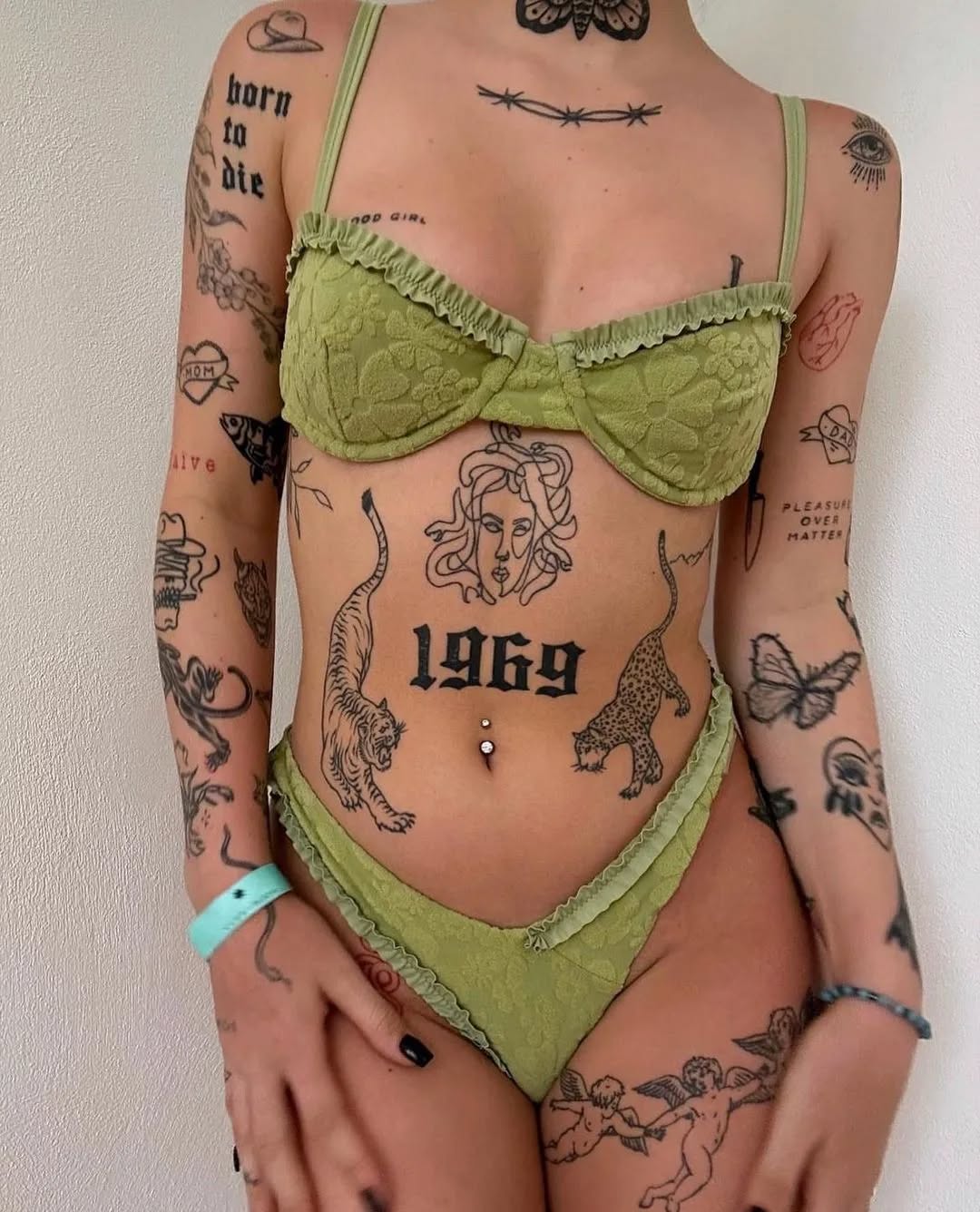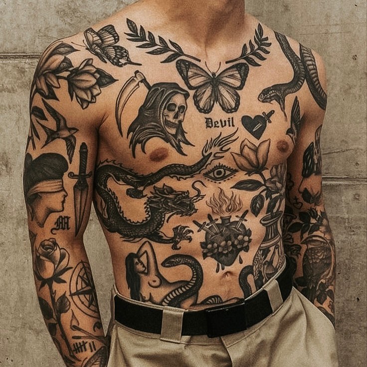 This striking image showcases a body adorned with a variety of tattoos, each telling a different tale. From mythical creatures to symbolic designs, the patchwork of ink reflects the wearer s unique journey and interests. For those considering a similar style, mixing different themes can create a captivating look that truly represents personal experiences and beliefs.