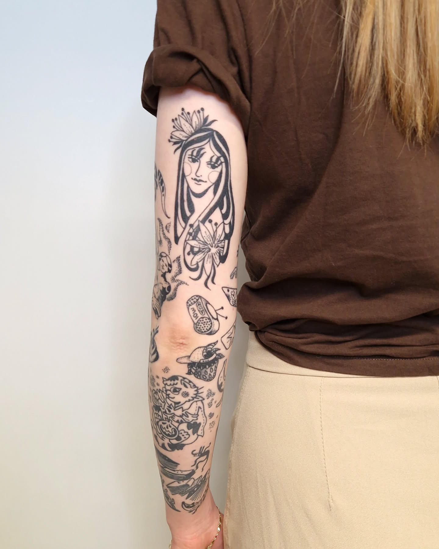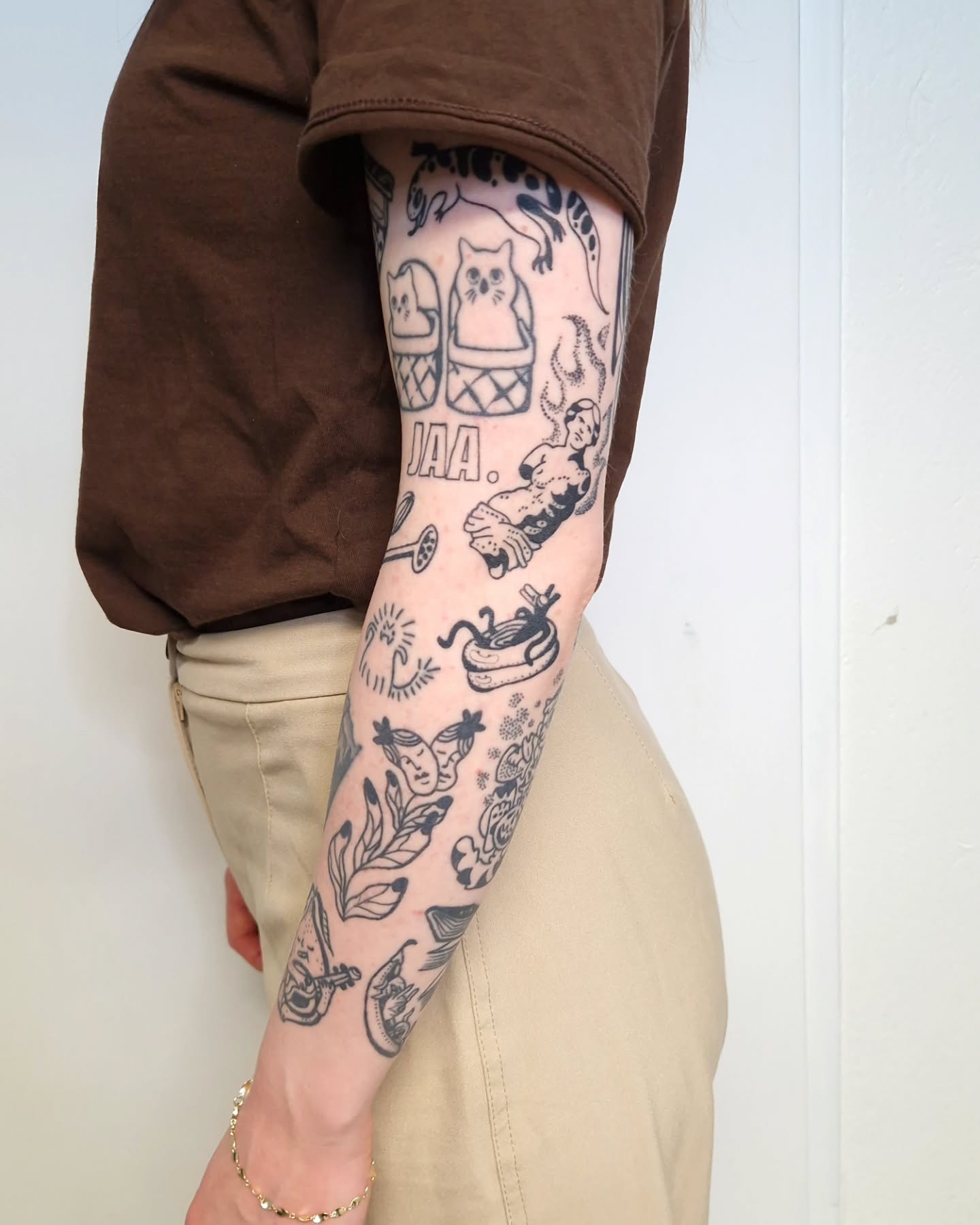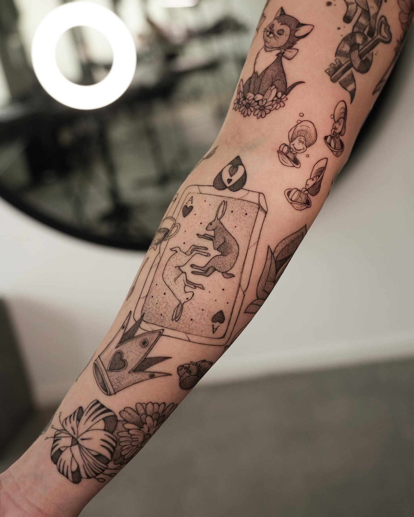 This arm showcases a delightful mix of whimsical tattoos, featuring playful animals and charming motifs. Each piece tells a unique story, blending together in a patchwork of creativity that reflects the wearer’s personality. For those considering similar designs, remember that each tattoo can be a conversation starter, connecting you to others who share your interests.