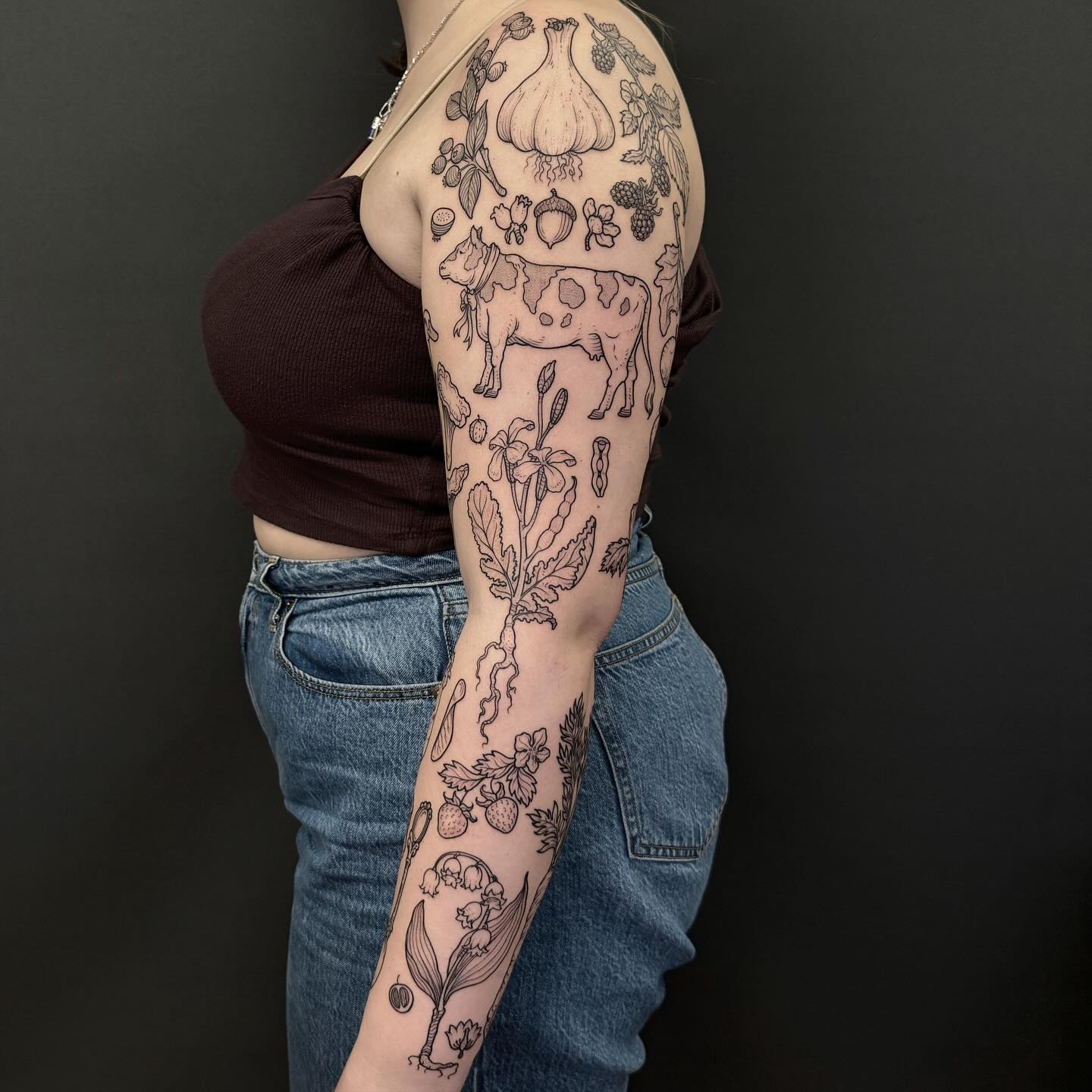 This stunning tattoo showcases a delightful mix of flora and fauna, transforming the arm into a unique canvas of art. Each design tells its own story, with elements like flowers, vegetables, and even a cow, celebrating the beauty of nature. For those considering this style, choosing symbols that resonate personally can make the piece even more meaningful.